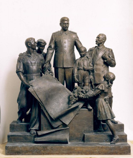 В первые послевоенные годы, когда Манизер совместно с бригадой создавал эту большую семичастную композицию «Борьба за мир», тема борьбы за мир, расколовшийся на две социальные системы, была особенно актуальна. Выполненная в присущей духу времени четкой, детально проработанной реалистической манере, эта композиция пластическими средствами подробно «рассказывает» о различных проявлениях мирной жизни и борьбы против войны. Каждая часть, снабженная развернутым литературным названием (например, «Американские снаряды — в воду» или «Он пишет слово „Мир“»), несет идеологическую нагрузку, являясь, по сути, скульптурным плакатом на антивоенную тему. Представленный фрагмент — центральная часть композиции, где фигура Сталина в окружении народа символизирует «оплот мира во всем мире». Страна побед. СПб, 2025. С. 169 / Для счастья народа. Каталог выставки Русского музея в Малаге. 2018. С. 112.