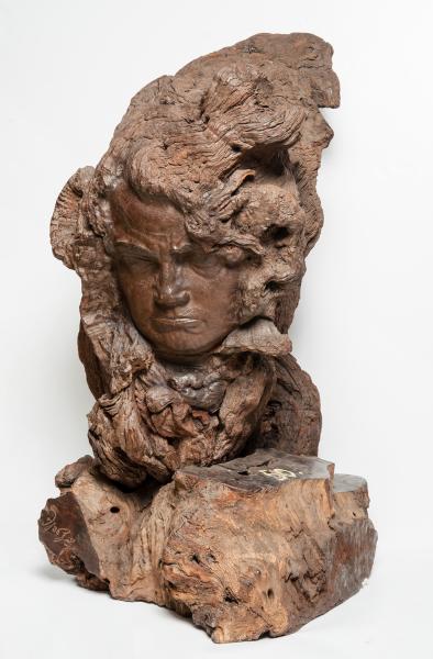 Портрет Бетховена отличается внутренней мощью, величием и даже несколько суровым обликом, что в целом не характерно для творчества Эрьзи, но встречается в его мужских портретах. Композитор изображён скульптором за работой, во время творческого и эмоционального напряжения. Его строгое лицо с нахмуренным лбом и плотно сжатыми губами подчёркивается мощным объёмом необработанной древесной массы вокруг лица. Фактурные элементы — не просто декор, это сама музыка, которая в своей буйной и всепоглощающей стихии окружает гения.