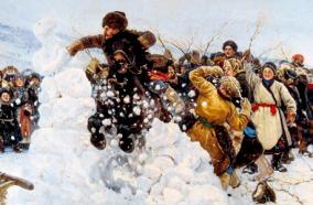 Существовало поверье, если на Масленицу не будет потех и веселья, то жить придется в горькой беде. Поэтому пекли блины с маслом и сметаной, оладьи, ходили друг к другу в гости, катались на лошадях в разукрашенных и укрытых коврами санях, одевались в разные наряды. В городах устраивались шумные балаганы. Люди забывали про холода, зимние морозы, про тоску и печаль, и веселились от души, устраивая массовые игрища. Как раз такой момент - взятие снежной крепости, снежного городка и запечатлел на своей картине Василий Суриков.