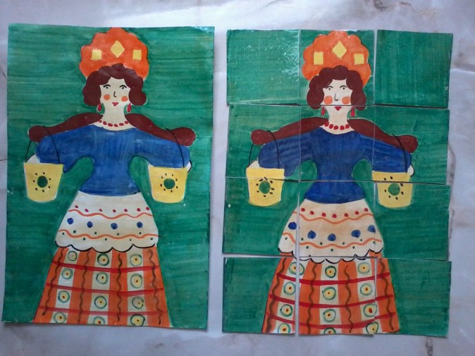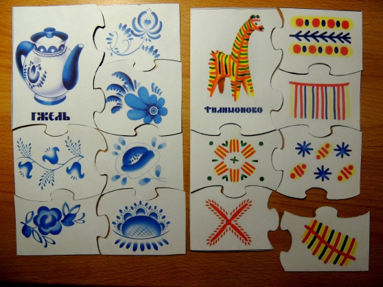 Для наших гостей мы подготовили презентацию по основным народным промыслам России, небольшой фильм об истории появления матрешки, фильм "Народное искусство" и фрагменты из одноименного электронного каталога из медиатеки Виртуального филиала Русского музея, познакомились с основными элементами Городецкой росписи, Жостова, Дымковской и Филимоновской игрушки.Ребятам очень понравилось складывать пазлы из изображений персонажей Дымковской игрушки, раскрашивать заготовленные шаблоны рассмотренных образцов народных промыслов, малышам очень понравилась игра "Цветные капельки", помогающая выделять и называть цвета, входящие в цветовую гамму народной росписи (гжельской, городецкой, хохломской).