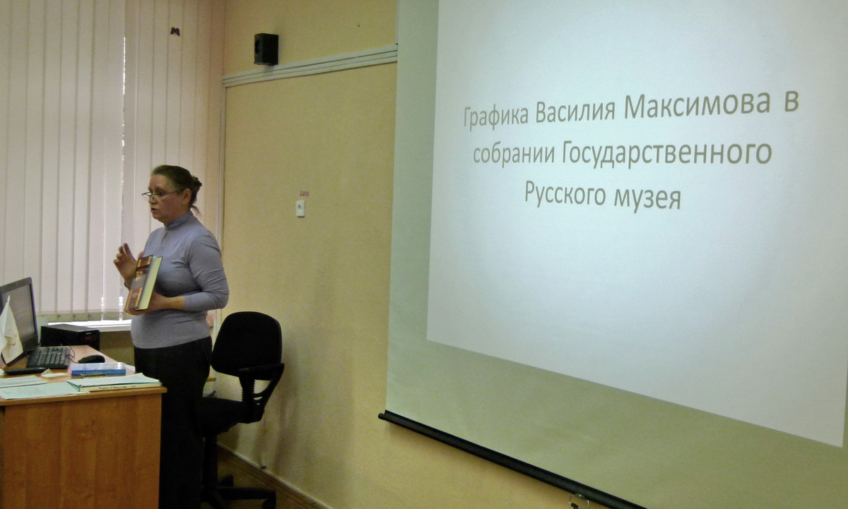 Сотрудник Новоладожского историко-краеведческого музея Н.Ф.Морозова выступила с докладом "Графика Василия Максимова в собрании Государственного Русского музея". Выступление Натальи Фёдоровны было посвящено малоизвестным, хранящимся в запасниках Русского музея рисункам знаменитого художника. Доклад отличали глубина, пристальное внимание к деталям работ, скрытым от широкой публики.