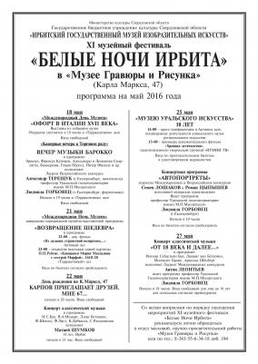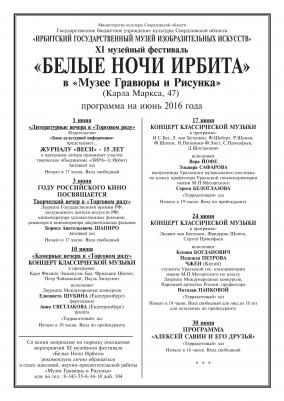 Уже по доброй традиции с 18 мая по 30 июня мы проводим музейный фестиваль «БЕЛЫЕ НОЧИ ИРБИТА». Программа XI фестиваля, как всегда, очень насыщенна, поэтому мы заранее выкладываем всю информацию, чтобы Вы смогли заранее спланировать свой культурный отдых.