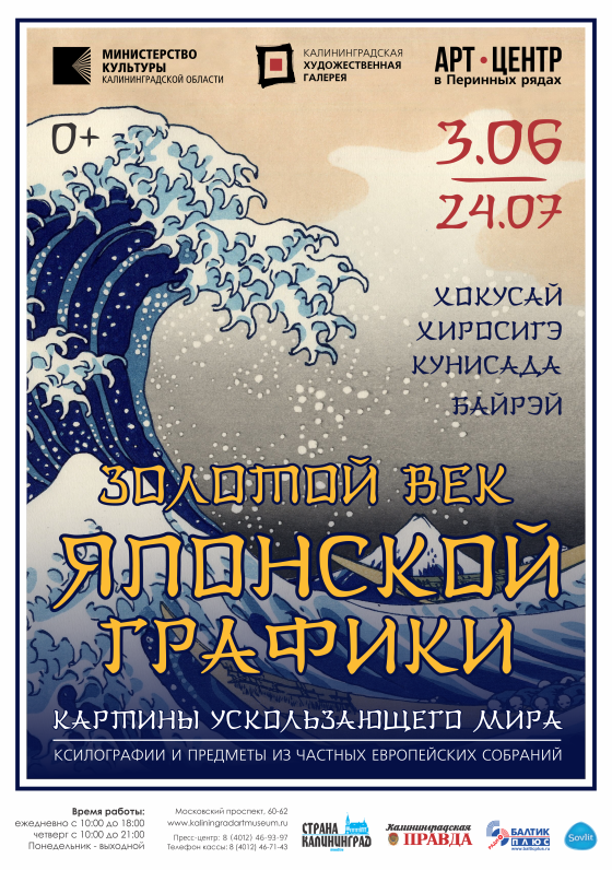 Цветение сакуры, заснеженные вершины священной горы Фудзи, портреты красавиц-гейш и актеров кабуки, сражения императоров и самураев – всё это вдохновило художников столицы Японии на создание работ, представленных на выставке «Золотой век японской графики» в Калининградской художественной галерее. «Картины ускользающего мира» — по-японски «укиё-э» — такое название носит графика эпохи Эдо (XVII – первой половины XIX веков). Заимствованное из философии дзэн-буддизма понятие подчеркивает эфемерность исчезающих мгновений и умение наслаждаться сиюминутным в быстро утекающей реке времени. Цветная гравюра не имела аналогов в странах Дальнего Востока. В Японии же была необычайно популярна: ею украшали интерьеры домов, использовали в качестве афиш для театральных постановок, рекламы чайных домов и «веселых» кварталов. Расцвет укиё-э тесно связан с периодом возвышения Эдо — современного Токио. Уже к началу XVIII века город обладал миллионным населением и превосходил по размерам все европейские столицы. Эпоха Эдо — период расцвета не только в изобразительном искусстве Японии, но и в литературе, поэзии, театре. Слава признанных шедевров ксилографии, созданных такими мастерами как Кацусика Хокусай, Андо Хиросигэ, Утагава Кунисада, Китагава Утамаро, быстро вышла за пределы Японии. Выставка «Золотой век японской графики» представляет "АРТ-центр в Перинных рядах" (г. Санкт-Петербург).
