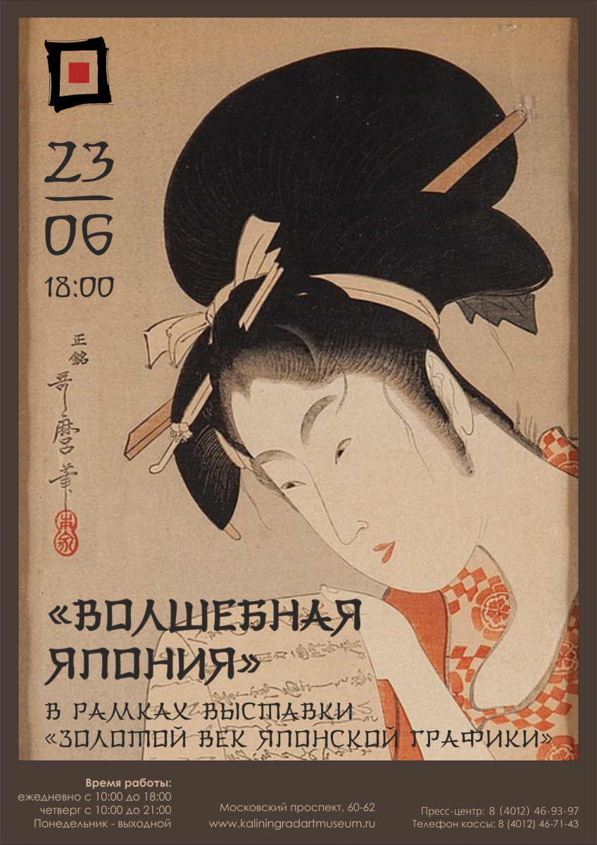 Погрузиться в сказочный мир Японии, почувствовать величие этой страны через прикосновение к прекрасному миру искусства приглашает Калининградская художественная галерея всех гостей вечера «Волшебная Япония», который пройдет в рамках выставки «Золотой век японской графики» 23 июня в 18:00.