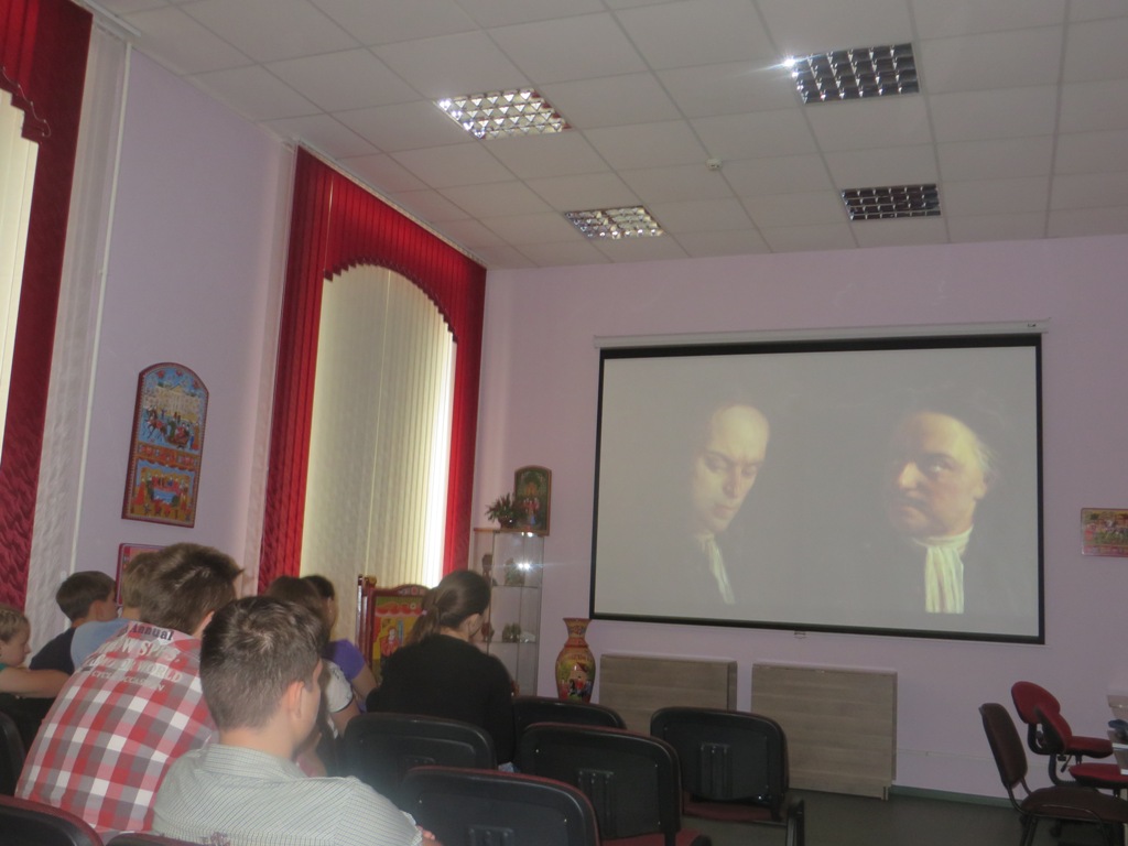 Также ребята совершили виртуальное путешествие в картину Г.Чернецова «Парад на Царицыном лугу» и посмотрели мультимедийный фильм из цикла «Сага о династии Романовых» (об известной картине Н.Н.Ге «Петр I допрашивает царевича Алексея в Петергофе»), раскрывающий обстоятельства трагического противостояния Петра I и царевича Алексея, отца и сына, добра и зла.