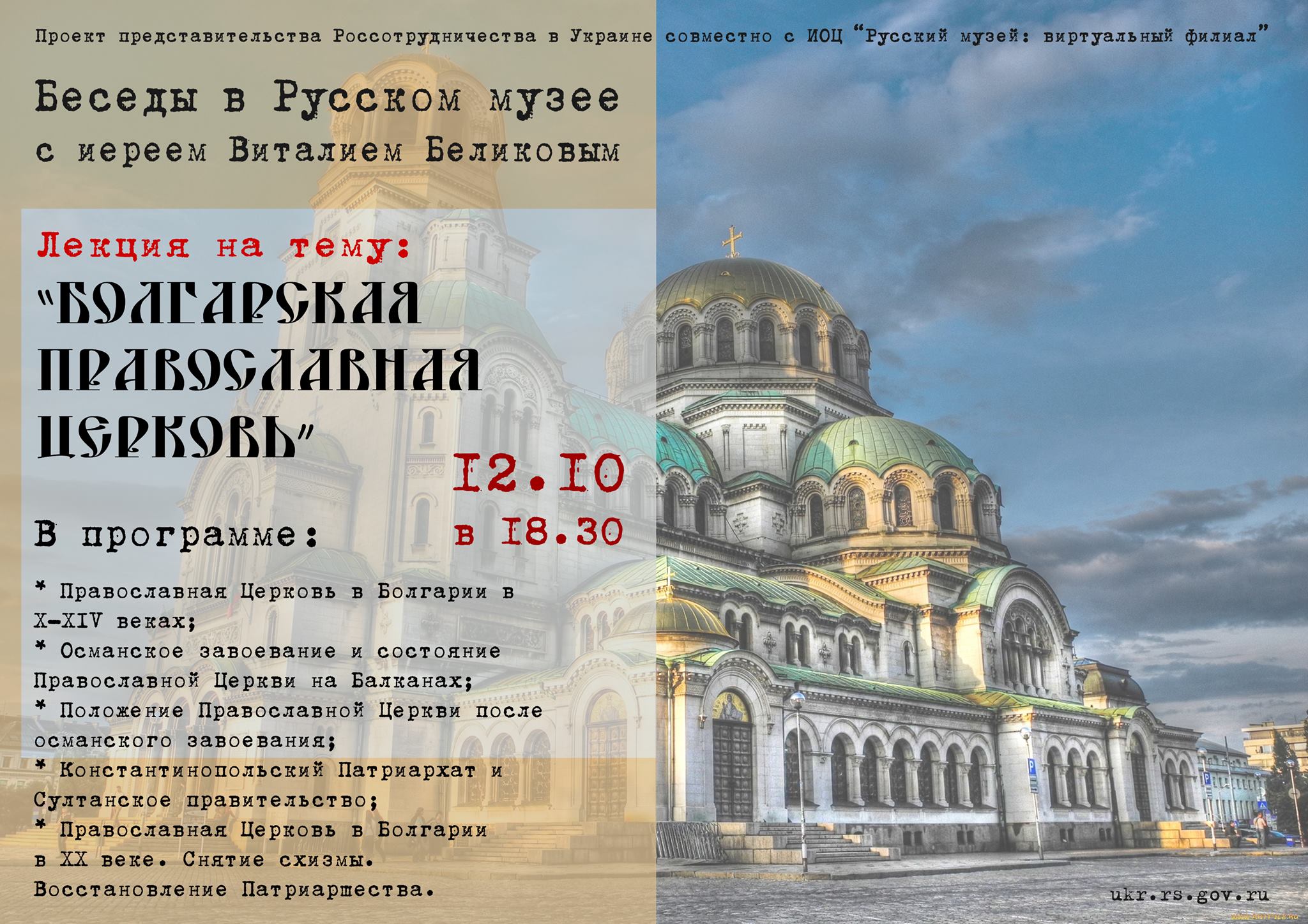 12 октября в 18.30 в Концертном зале РЦНК (ул. Борисоглебская, 2 м. «Контрактовая площадь», «Почтовая площадь») мы поговорим о Православной Церкви в Болгарии.