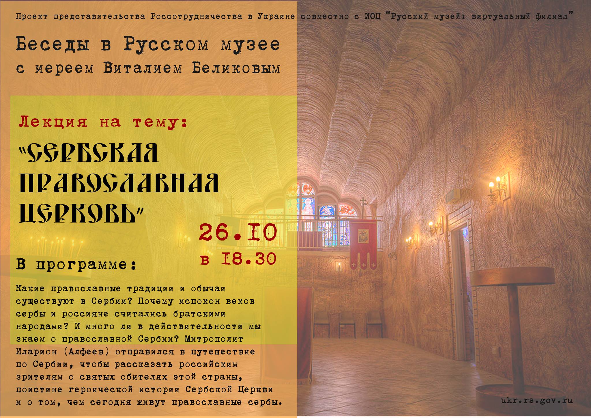 26 октября в 18.30 в Концертном зале РЦНК (ул. Борисоглебская, 2 м. «Контрактовая площадь», «Почтовая площадь») мы поговорим о Православной Церкви в Сербии.