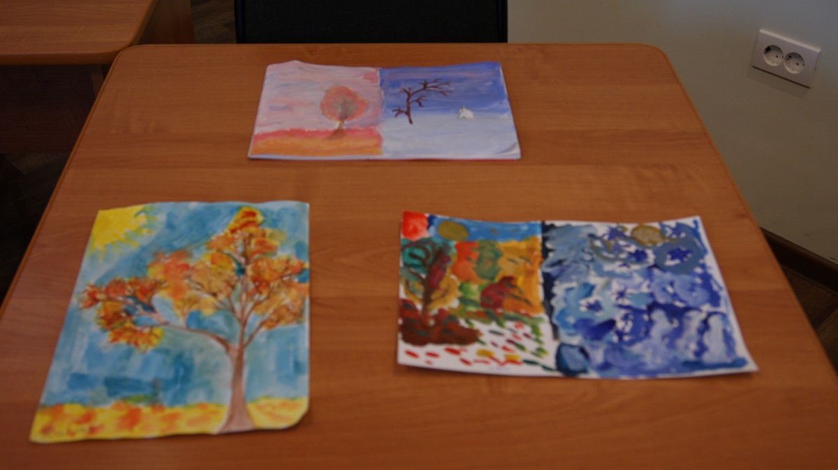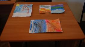 Учащиеся посмотрели фрагмент видеофильма «Палитры» для детей младшего возраста. В фильме доступно и понятно рассказывается, как живописными средствами – цветом, точкой, линией, пятном – можно выразить свои ощущения и впечатления от морозной, холодной зимы и яркой, светлой осени. Зима никогда не бывает одинаковой, она может быть «мягкой», тёплой, слякотной, а осень хмурой и мокрой, но вместе с тем цветной. После просмотра фильма школьникам представилась возможность самим попытаться развить представление о том, что через подбор красок можно передавать в рисунке определенную погоду и настроение, показать изменчивость состояния природы. Рисунки получились у всех разными, а иначе и быть не могло – ведь у всех эмоциональное восприятие окружающей действительности разное, и палитра красок у каждого своя.