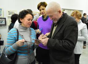Символ нового года Виталий Петрович передал в дар и директору КВЦ «Радуга» «с пожеланиями добрых дел». Все гости выставки подписали у автора поздравительную новогоднюю открытку.