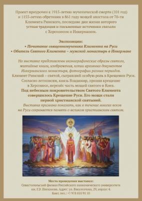 Выставка посвящена почитанию на Руси священномученика Климента Римского, последние дни жизни которого устная традиция и письменные источники связали с Херсонесом и Инкерманом. Особенно символично открытие выставки именно в день памяти Священномученика Климента Римского. И, конечно же, в преддверии Нового года и Рождества Христова, в дни рождественского поста в стенах просветительского и культурного центра «Русский музей: виртуальный филиал» собрались представители духовенства и администрации Севастополя, художники и искусствоведы, преподаватели и студенты филиала, жители города и представители сми. Всех объединила одна цель – укрепить свои духовные силы, опираясь на традиции православной веры и культуры.