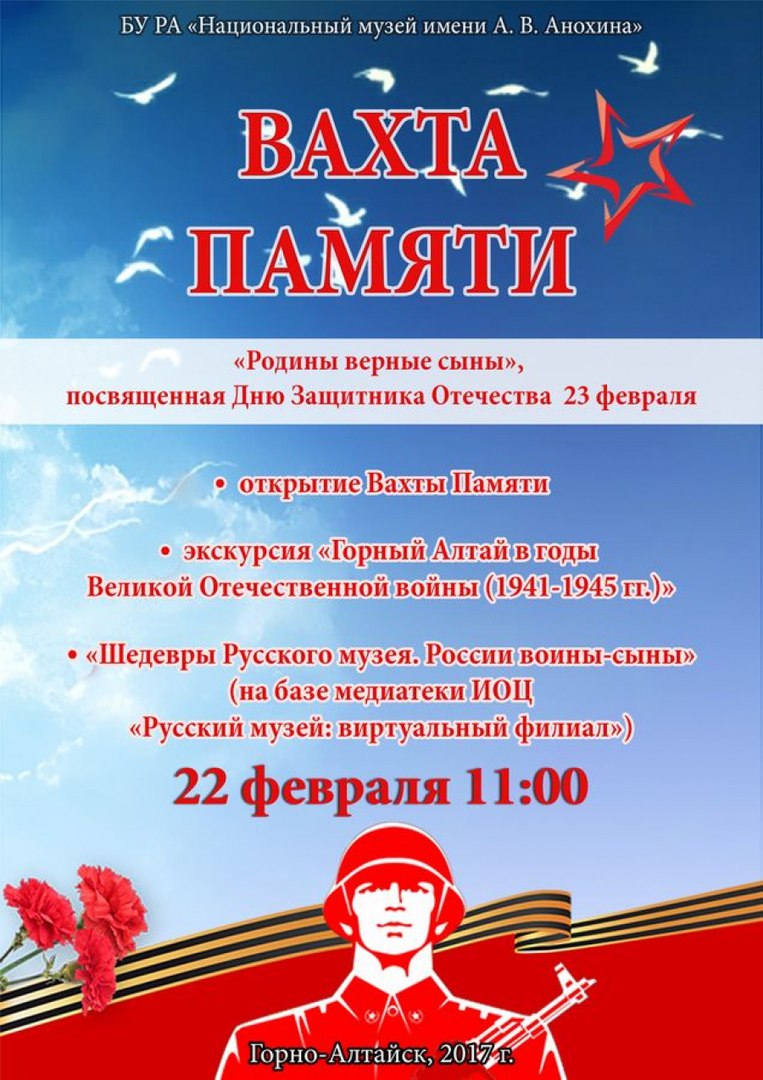 В ознаменование славных боевых традиций защитников Отечества 22 февраля 2017 г. Национальный музей открыл ставшую уже традиционной Вахту памяти «Родины верные сыны». Данное мероприятие было организованно совместно с Советом Алтайского Регионального отделения Всероссийской общественной организации ветеранов «Боевое братство» (председатель А.М. Вилисов).