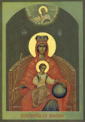 С разрешения настоятеля Вознесенского храма, в его подвале, среди старых икон, Евдокия и отыскала похожий, на явленный ей во сне, образ – на иконе было изображение Богородицы, восседавшей на престоле с Богомладенцем на коленях. В своих руках Матерь Божия держала царские регалии – скипетр и державу. По этому изображению икону и стали именовать «Державной».