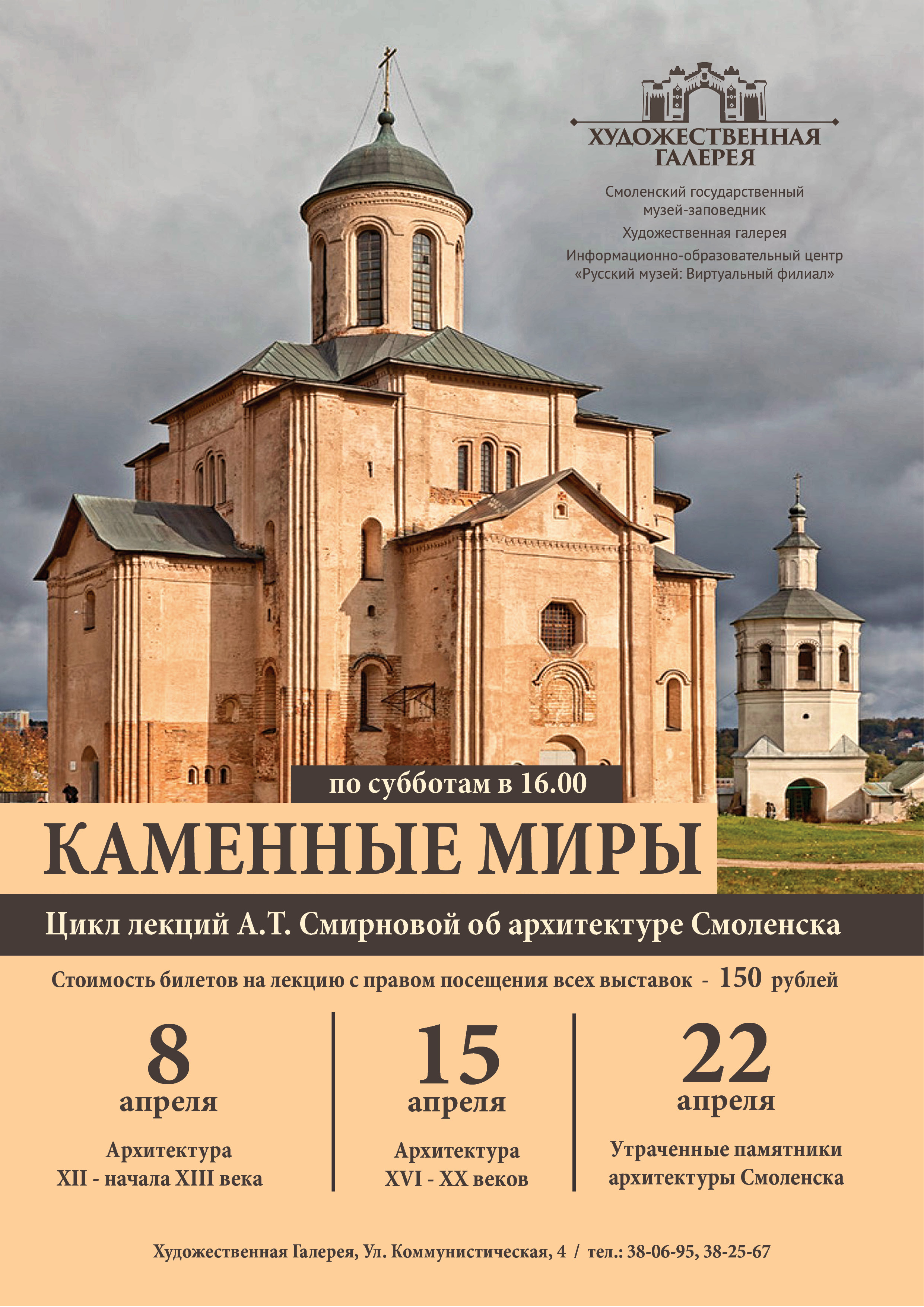 Смоленский государственный музей-заповедник и информационно-образовательный центр «Русский музей: виртуальный филиал» представляют цикл лекций «Каменные миры», посвященный архитектуре Смоленска. Лекции состоятся в Художественной галерее. Лектор – Антонина Тихоновна Смирнова.