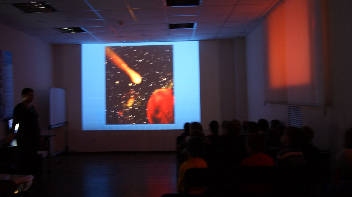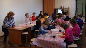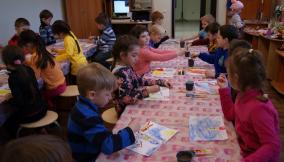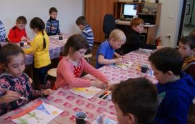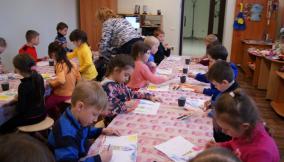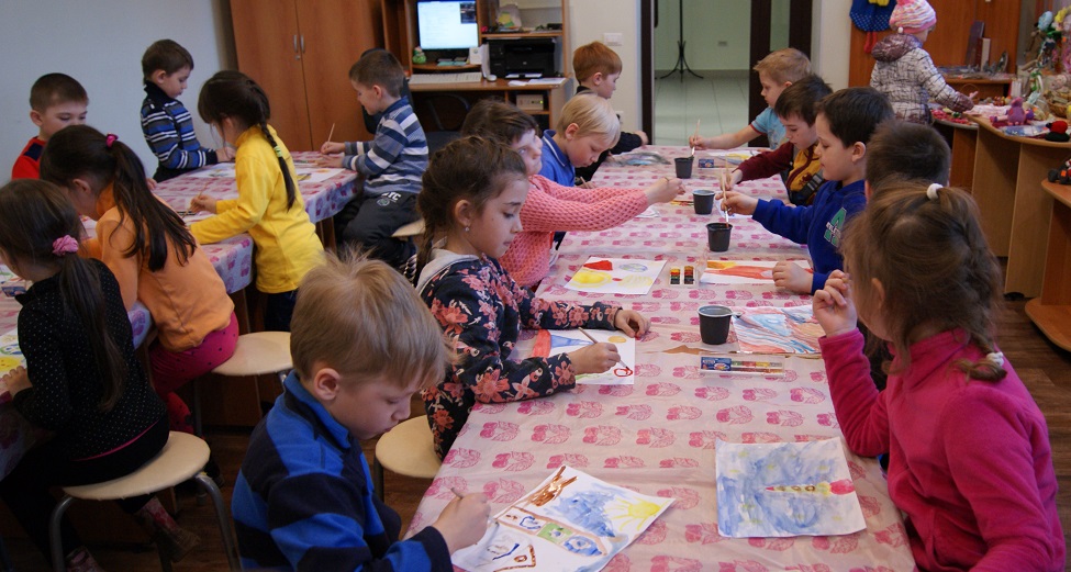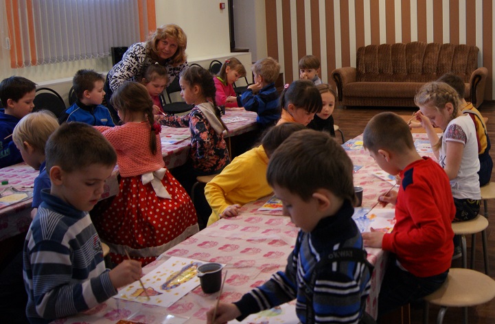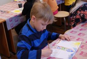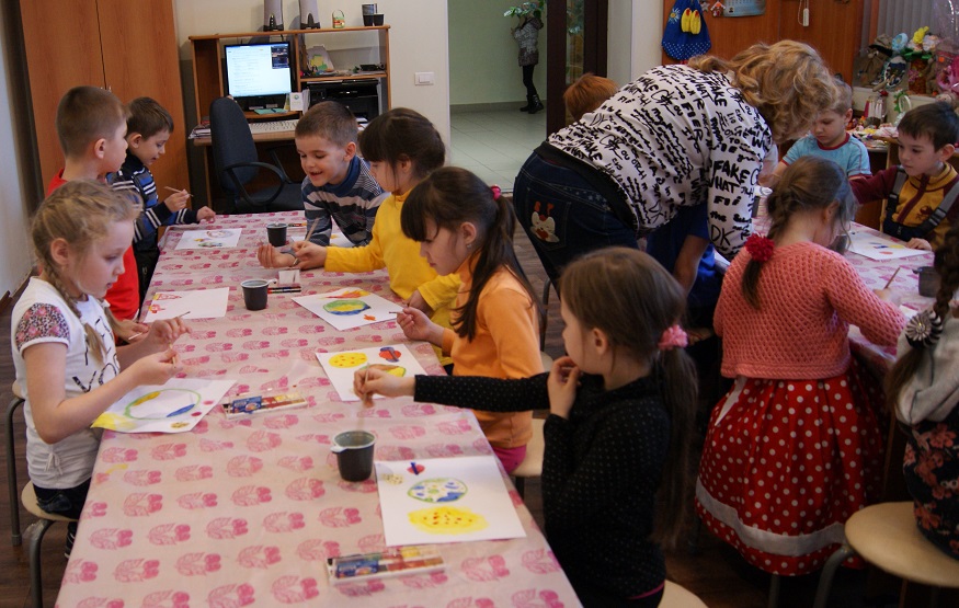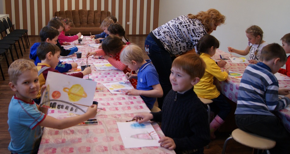 Просмотр фотографий космических кораблей и прослушивание речи Гагарина перед стартом и в космосе – всё это очень впечатлило детей. Предложение нарисовать космический пейзаж или стартующий межпланетный корабль они приняли с радостью. Под песни разных авторов о космических далях и их покорении, в исполнении советских и современных певцов и музыкальных групп, дети выполнили свои рисунки. Вот корабль на старте готовится к полёту, вот он лети всё выше и выше, и от него отделаются ступени. А здесь миниатюрный звездолёт «бороздит просторы вселенной», уверенно лавируя между гигантскими разноцветными планетами. На других рисунках несколько межпланетных кораблей необычных форм и расцветок посылают друг другу радиосигналы. А вот неожиданная встреча – космонавт с Земли совершил посадку на неизвестную оранжевую планету и встретил там под жёлтым дождём зелёного инопланетянина. Собираться в долгий полёт в космос могут не только земляне – на одном из рисунков пирамидальный синий корабль готов к отлёту с красной планеты, а полетят на нём два зелёных человечка с рожками.