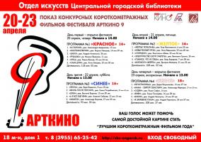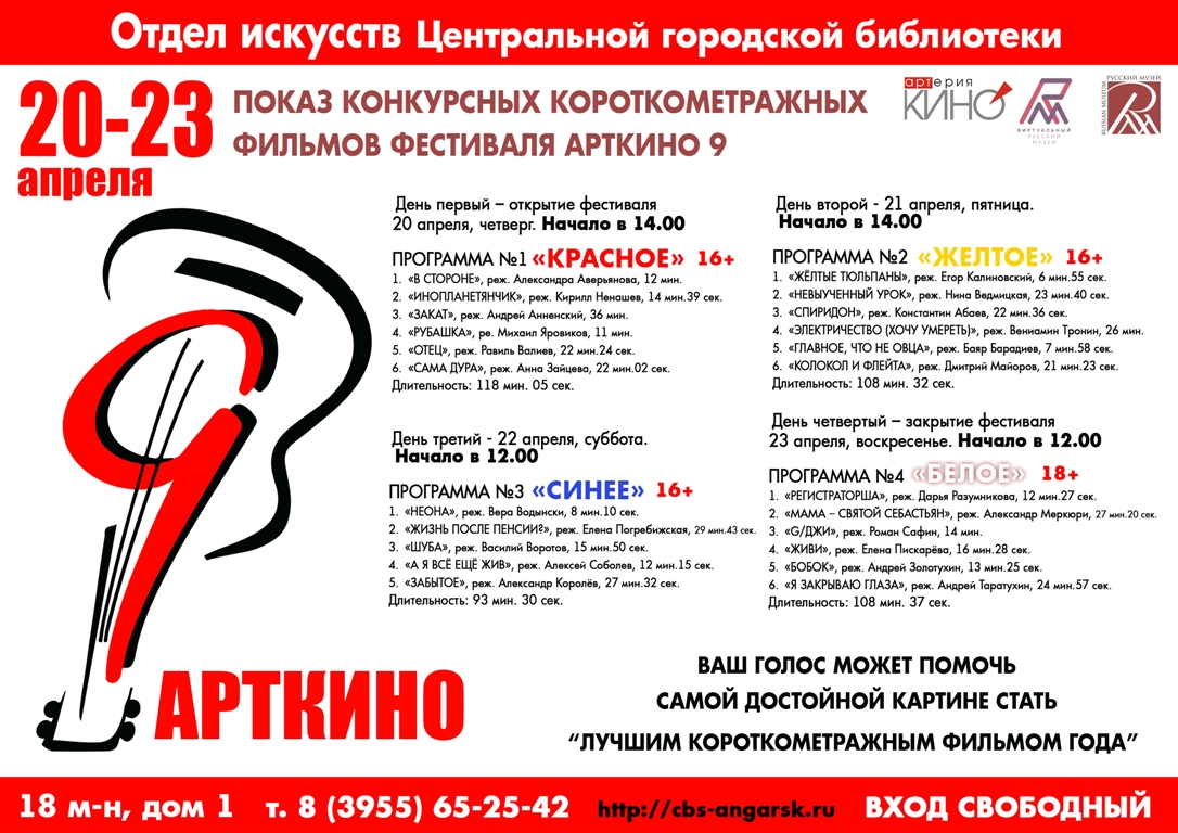 В рамках IX Всероссийского конкурса-фестиваля «АРТкино» в отделе искусств ЦГБ 20 и 21 апреля в 14 часов, а 22 и 23 – в 12 часов будут организованы бесплатные показы авторских короткометражных фильмов, ставших победителями в разных номинациях. Вниманию зрителей предложат 23 «короткометражки», созданные в разных стилях и жанрах режиссерами-профессионалами или любителями и разделенные на четыре программы по цветам: «Красное», «Желтое», «Синее» и «Белое». Ангарчанам снова предстоит выбрать лучший из этих фильмов.