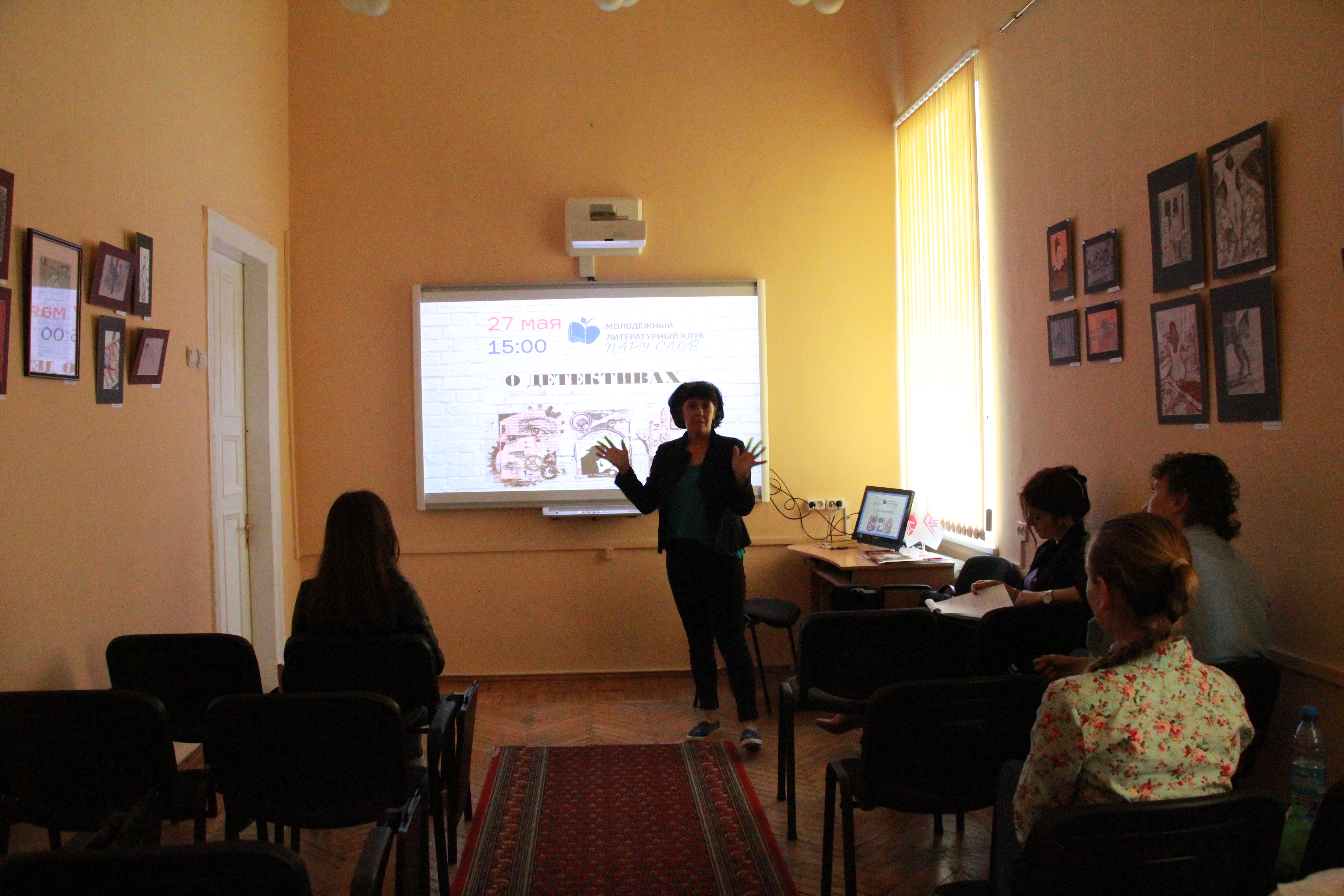 Бессменный спикер клуба Евгения Кудревич познакомила слушателей с особенностями и «схемами» создания детективов и их разнообразием. Детективы классические, «перевёрнутые», исторические, романтические, политические и другие открыли свои секреты любознательным.
