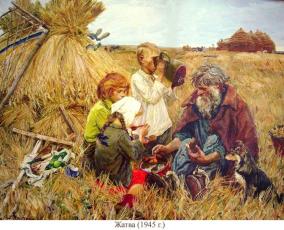 Еще одно из самых известных своих произведений – «Жатва» – художник посвятил старикам, женщинам, детям, самоотверженно работавшим в тылу.