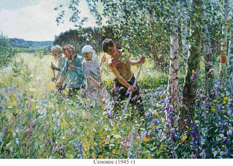 Радостным гимном освобождения, Победы стала картина «Сенокос», написанная Пластовым в 1945 году. Всё здесь наполнено взволнованными чувствами художника, который, работая над полотном, всё время думал: «Ну, теперь радуйся, брат, каждому листочку радуйся – смерть кончилась, началась жизнь!».