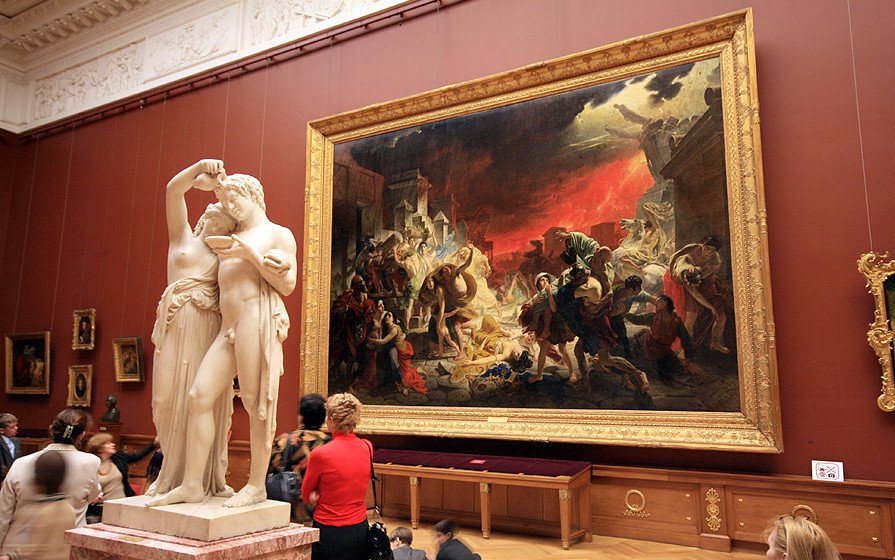 «Последний день Помпеи» — самое известное полотно Карла Брюллова. Шедевр создавался долгих шесть лет — от замысла и первого эскиза до полноценного полотна. Ни один русский художник не имел такого успеха в Европе, как молодой Брюллов, которому на тот момент было 34 года. За художником очень быстро закрепилось символичное прозвище «Великий Карл», что соответствовало масштабу его шестилетнего многострадального детища — размер холста достигал 30 квадратных метров (!). Примечательно, что само полотно было написано всего за 11 месяцев, все остальное время ушло на подготовительную работу.
