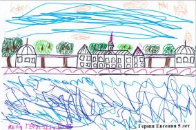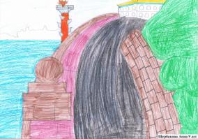 - Щербакова Анна, 9 лет, ученица 3-го класса ГОУ СОШ № 545. Конкурсная работа «Петербург», на рисунке изображена набережная на стрелке Васильевского острова, здание Биржи и Ростральные колонны.