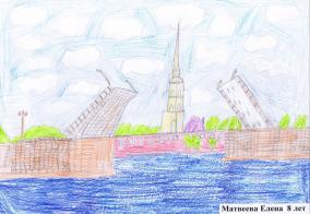 - Матвеева Елена, 8 лет, ученица 2-го класса ГОУ СОШ № 545. Конкурсная работа «Санкт-Петербург», на рисунке изображен вид на Петропавловскую крепость и Троицкий мост со стороны Дворцовой набережной.