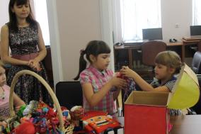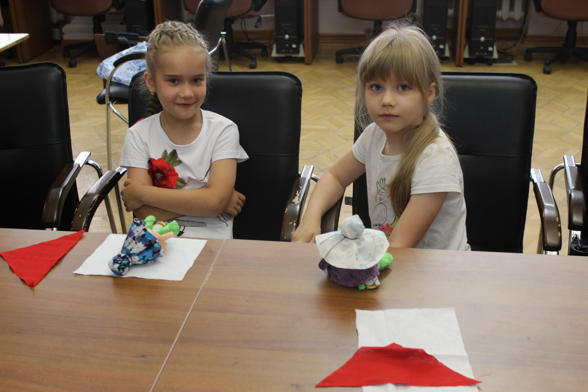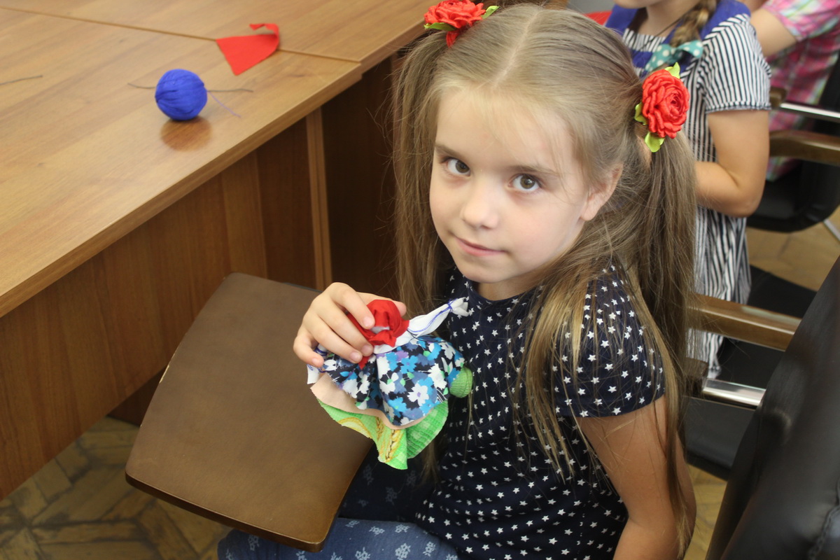 Затем старшие научные сотрудники отдела «Русский музей: виртуальный филиал» Пудовкина Н.В. и Педченко Е.В. провели мастер-класс для детей по изготовлению куклы – «Колокольчика». Считается, что эта кукла приносит в дом радость и веселье, это оберег хорошего настроения. Также и у детей получились радостные, весёлые, непохожие друг на друга куклы.