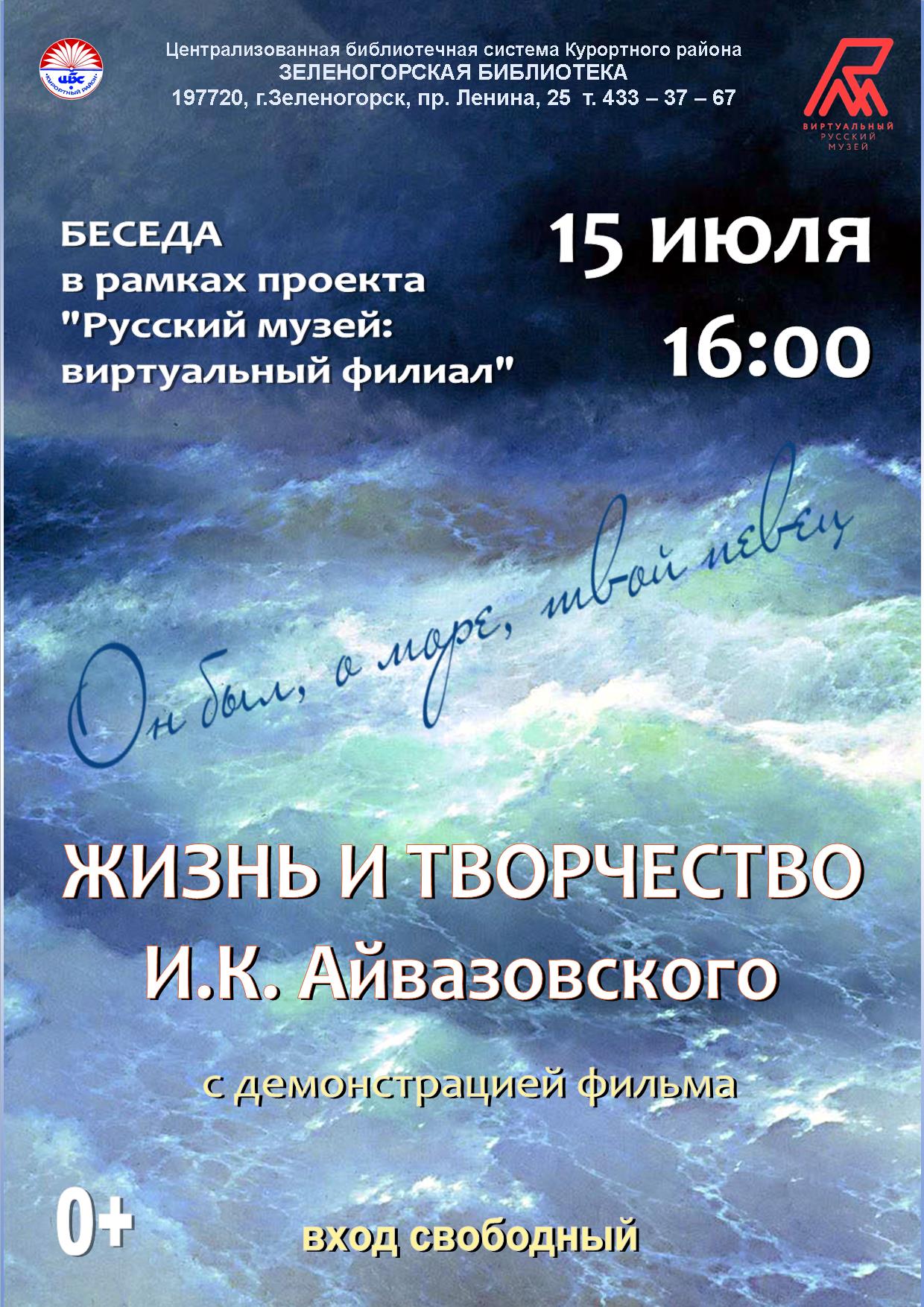 15 июля 2017 года в 16.00 в Зеленогорской городской библиотеке состоялась встреча, посвященная известному художнику-маринисту Ивану Константиновичу Айвазовскому.
