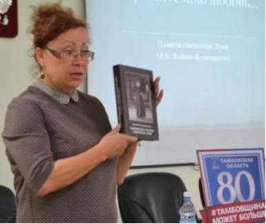 В начале своего выступления Галина Александровна предложила аудитории документальный фильм, далее презентацию, повествующие о развитии медицины на Тамбовщине, о судьбах и профессиональных достижениях выдающихся медиков Тамбовского края. Особое внимание Галина Александровна уделила деятельности архиепископа Луки. В Тамбовском крае он пробыл не много – около двух лет, оставив о себе добрую память в сердцах людей. «Для хирурга не может быть случая, а только живой страдающий человек», - говорил святитель Лука. Он не только духовно врачевал души людей, служа в Покровском храме города Тамбова, но и физические недуги, делая операции, порой обреченные на провал. Здесь он получил Сталинскую премию за труд «Очерки гнойной хирургии», которая и сегодня является учебником для многих хирургов.