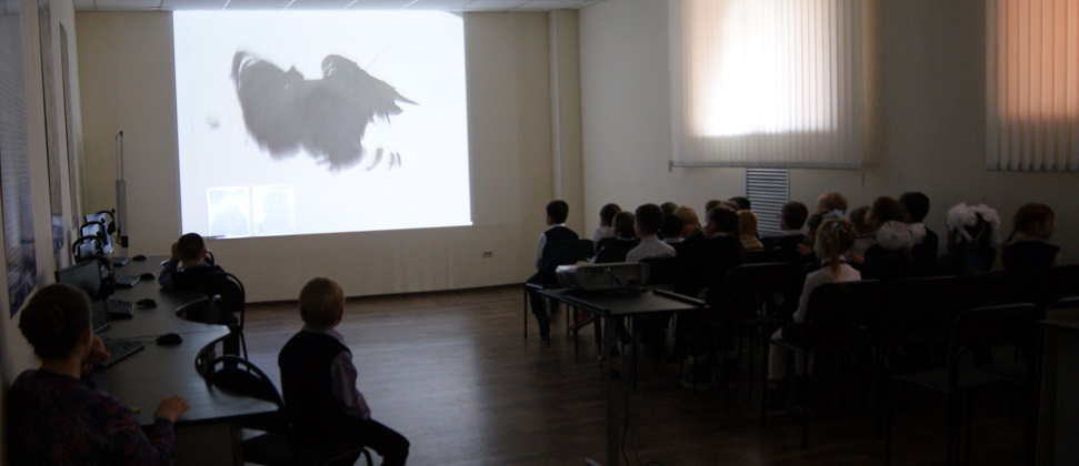 Ребята из этого класса уже не первый раз приходят сюда, поэтому они уверенно ориентируются в залах Центра культурных инициатив. Сегодня они посмотрели фильм из цикла «В мастерской художника». Очень часто дети видят то, чего не замечают взрослые. Оказывается, если внимательно присмотреться к рисункам на обоях, к маленьким неровностям штукатурки на стене, к разводам на поверхности грязной лужи, то можно увидеть много интересного: фантазийных животных, людей, и даже целые картины. А если посмотреть на облачное небо, то каждую минуту там одна картина сменяет другую.