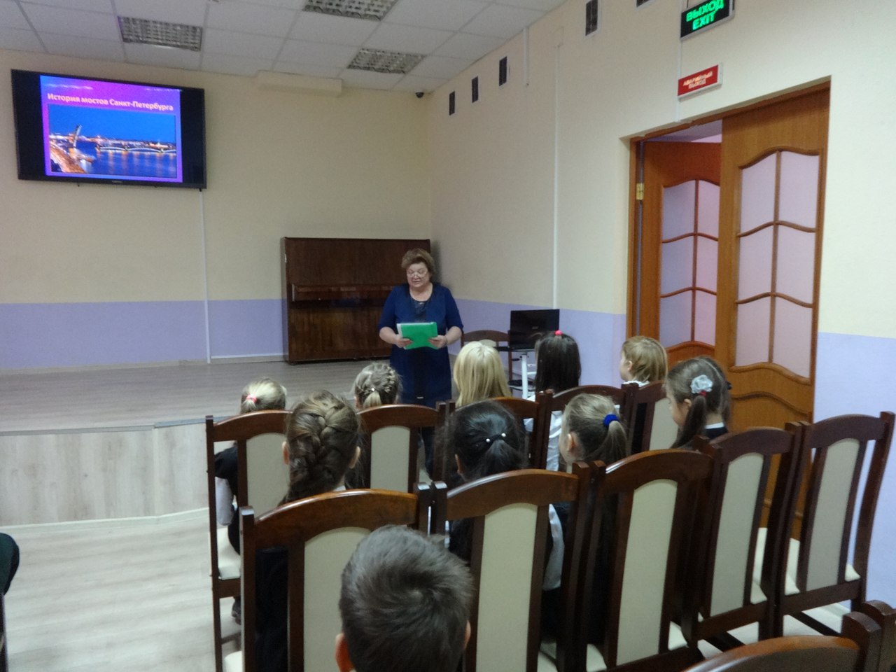 27 ноября библиотекарь зала искусства Зинаида Тимофеева провела беседу «История мостов Санкт-Петербурга» для учеников 4 класса школы №106. При подготовке и проведении мероприятия использовались видеоматериалы из цикла передач «Красуйся, град Петров и из Медиатеки Русского музея (интерактивная программа «Санкт-Петербург. Портрет города и горожан»).