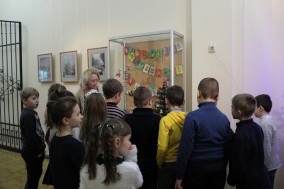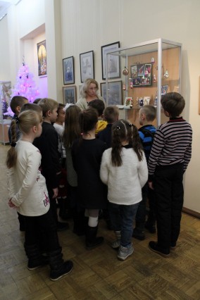Старший научный сотрудник Пудовкина Наталия Валерьевна познакомила детей с выставкой «Новогодний калейдоскоп» в галерее 3 этажа, где рассказала о истории праздника Рождества и какие были первые елочные игрушки. Дети узнали, как изменялись игрушки для елок с годами, из какого материала их делали. Ребята, рассматривая выставку, поделились своими впечатлениями и о поздравительных открытках, которые появились в XIX веке и как сегодня дети поздравляют своих родных и близких.