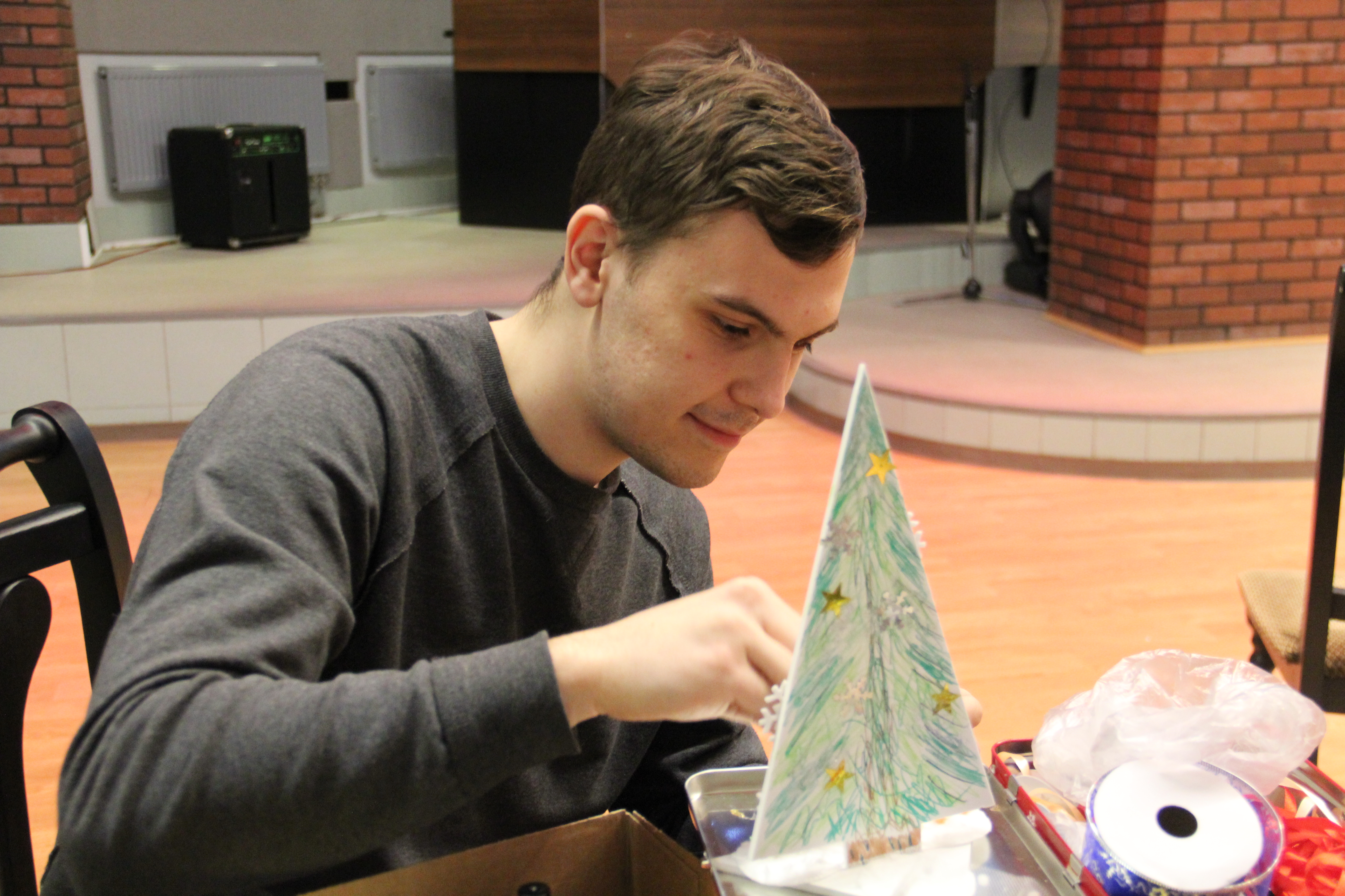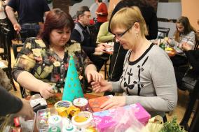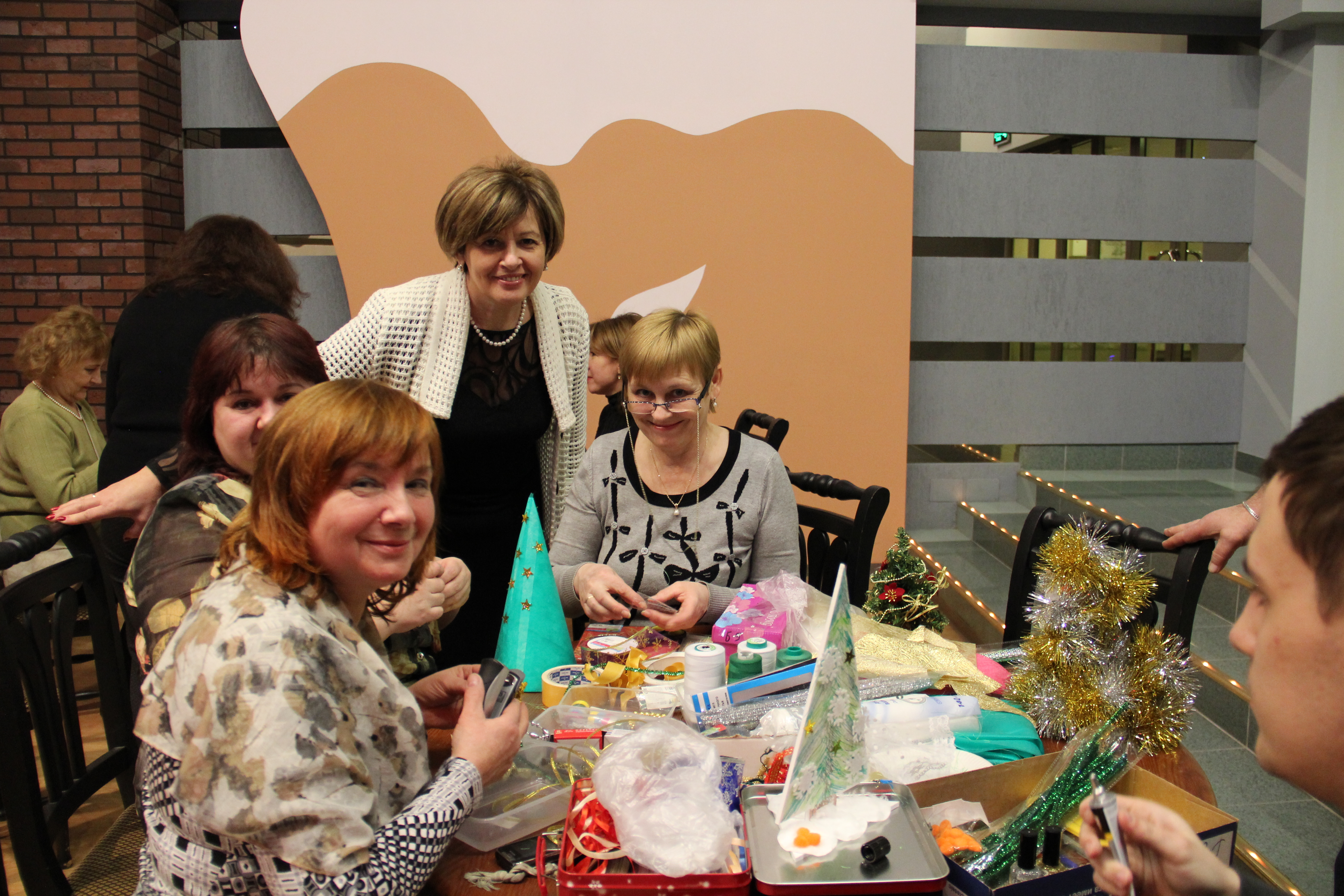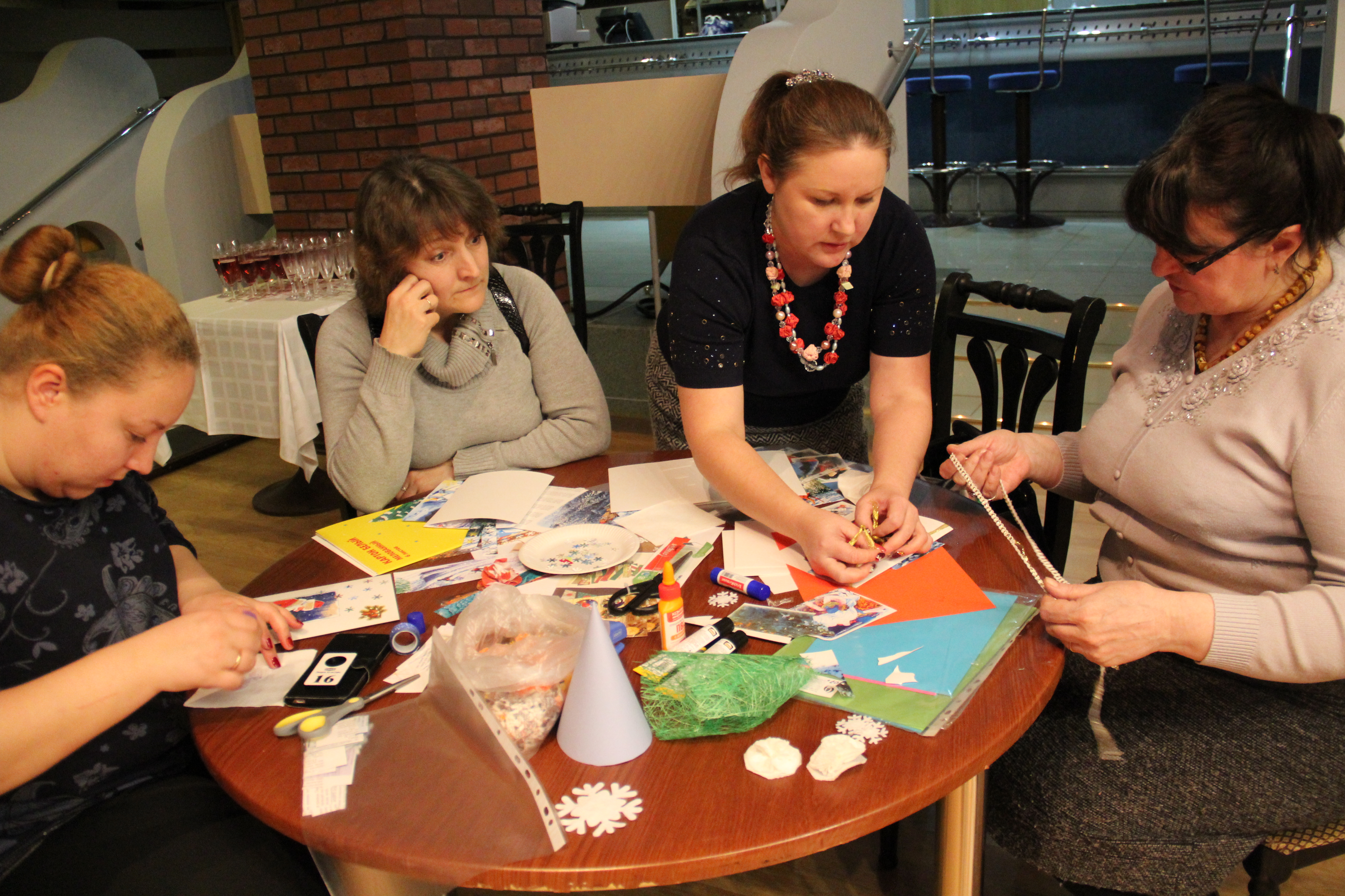 На творческую встречу мы пригласили сотрудников Дворца Культуры и гостиницы «Юность». Позабыв о серых буднях, взрослые окунулись в волшебный мир русского искусства. Познакомились с шедеврами и историей Русского музея. С увлечением попробовали себя в роли помощников Деда Мороза, изготовили новогодние игрушки и открытки, которыми украсили своё рабочее место.