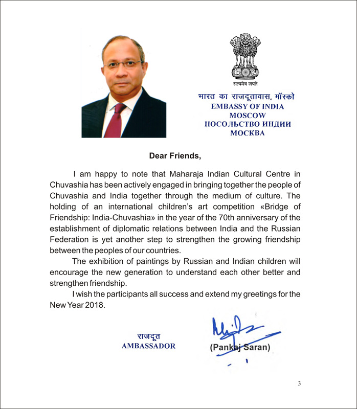 «Я рад отметить, что Индийский культурный центр «Махараджа» в Чувашии активно участвует в сближении народов Чувашии и Индии через культуру. Проведение международного конкурса детского творчества «Мост дружбы: Индия — Чувашия» в год 70-летия установления дипломатических отношений между Индией и Российской Федерацией — еще один шаг к укреплению растущей дружбы между народами наших стран», - Чрезвычайный и Полномочный Посол Индии в Российской Федерации господин Панкадж Саран.
