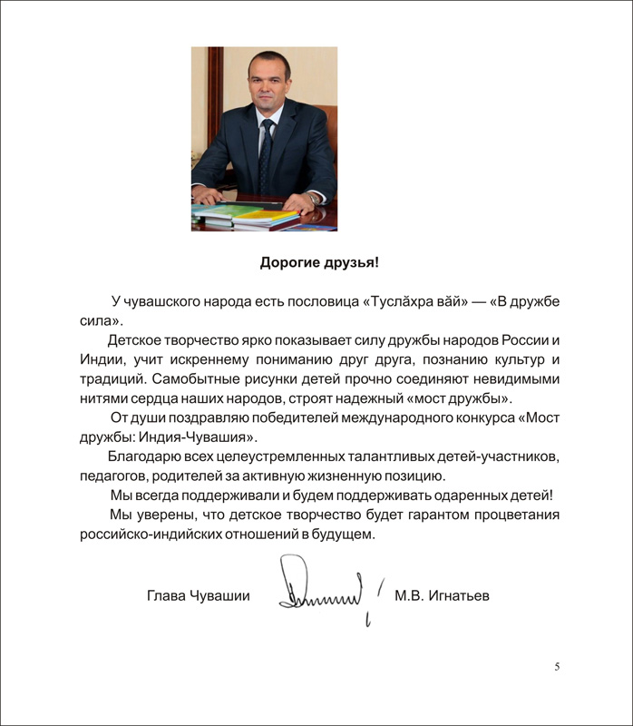 «У чувашского народа есть пословица «Туслăхра вăй» - «В дружбе сила». Детское творчество ярко показывает силу дружбы народов России и Индии, учит искреннему пониманию друг друга, познанию культур и традиций. Самобытные рисунки детей прочно соединяют невидимыми нитями сердца наших народов, строят надежный «мост дружбы», - Глава Чувашской Республики Михаил Игнатьев.
