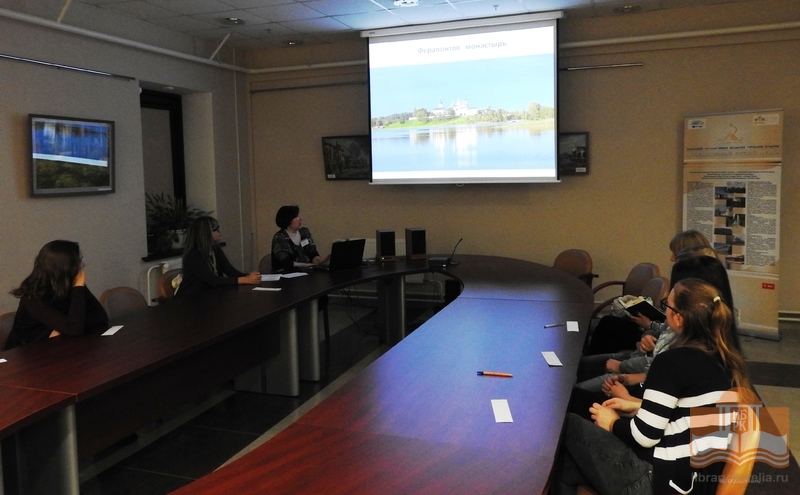 Школьники услышали рассказ об истории Ферапонтова монастыря и фресковой росписи Дионисия, украсившей собор Рождества Богородицы и увидели фрагменты фильма «Сокровища отдела древнерусского искусства» из медиатеки виртуального филиала Русского музея.