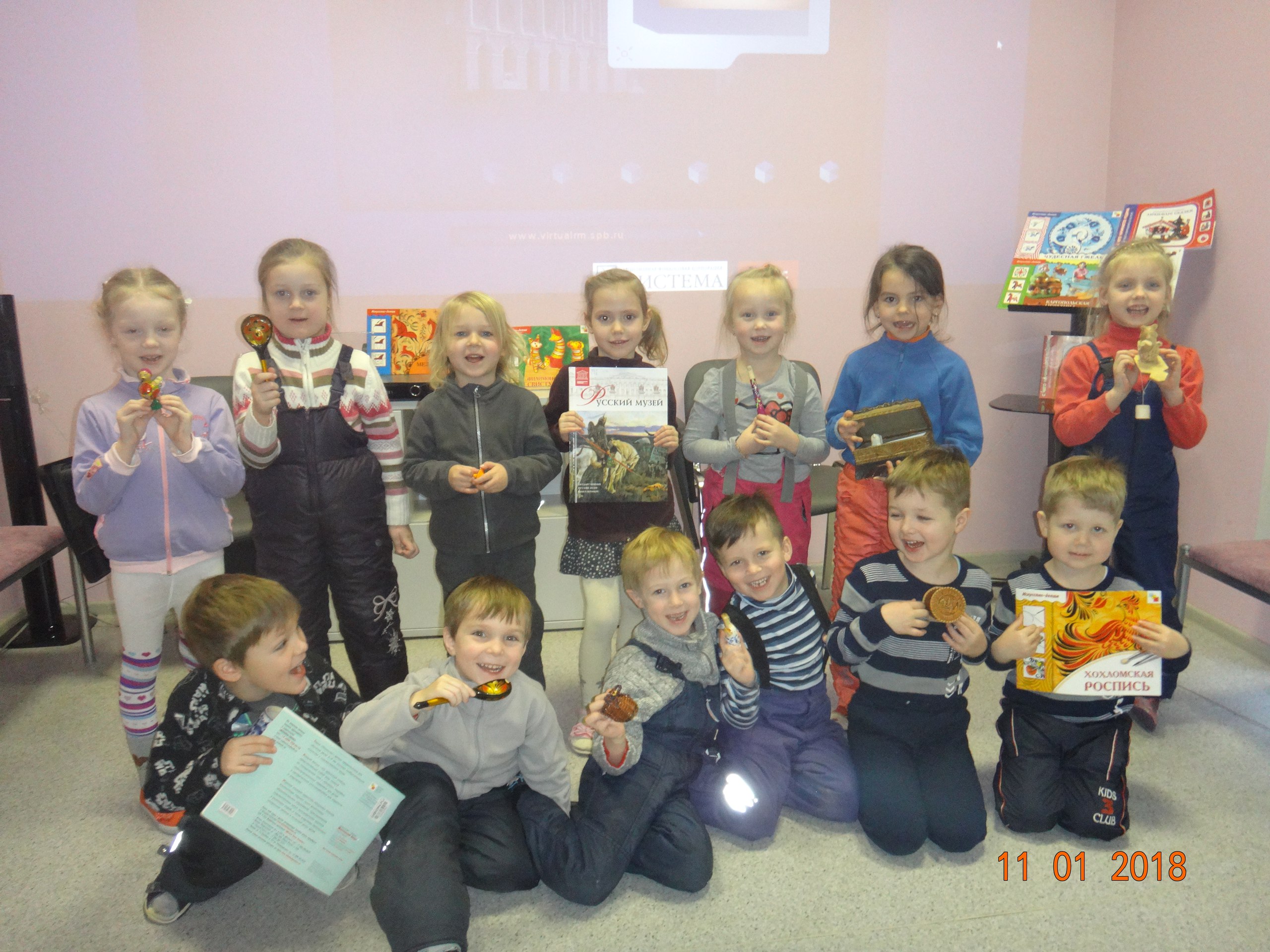 На занятии дети узнали о жизни на Руси, познакомились с традициями, русскими народными промыслами: Гжельская керамика , Хохломская роспись, Богородская резная игрушка. Попробовали играть на ложках, свистульках. На выставке "Красавица Гжель" увидели творческие работы учеников клуба "Нарвская застава". Посмотрели фильм "Русский народный костюм XVIII-XX вв." из медиатеки программ и фильмов Русского музея.