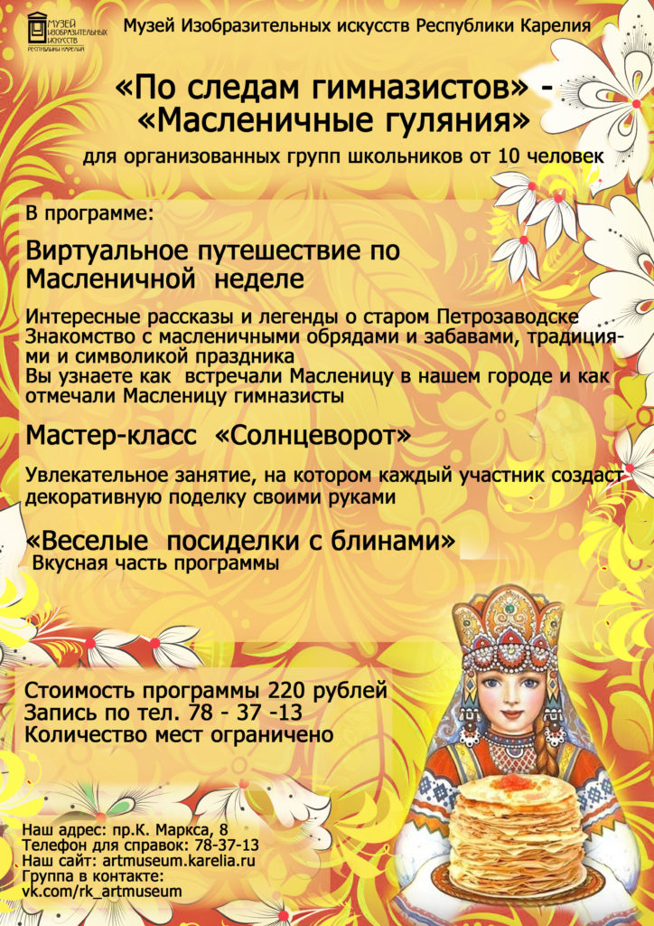 — Виртуальное путешествие по улице времени: Вы узнаете как встречали Масленицу в нашем городе полтора века назад, познакомитесь с масленичными обрядами и забавами, традициями и символами праздника, узнаете как отмечали  Масленицу воспитанники  Олонецкой  мужской гимназии.