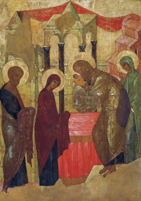 Сретение относится к числу Господских праздников, посвященных непосредственно Христу, но по своему богослужебному содержанию оно исключительно близко праздникам Богородичным. И в древности, в своем возникновении, рассматривалось как праздник, посвященный Матери Божией. На иконе праздника изображения Христа и Матери Божией равны по своей значительности: Младенец Спаситель, сидящий на руках Богоприимца Симеона, принимающего на руки свои Спасителя и являющего собою как бы ветхий мир, исполняющийся Божеством, и Матерь Божия, вышедшая на крестный путь – отдание Сына Своего на спасение мира. И вся икона в своем построении выражает эту двойственную природу праздника, радость Сретения и Страстную скорбь, то, что заключено в словах Симеона Богоприимца,– пророческий смысл слов старца: «Се, лежит Сей на падение и на восстание многих в Израиле и в предмет пререканий» (Лк. 2, 34). Эти слова полны эсхатологического смысла, относящегося ко всему служению Спасителя, исполнены прозрения конца времен и чаяния грядущего Суда и будущего века.
