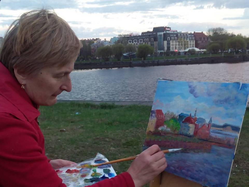 Художница показывает главную достопримечательность Выборга в тумане и при ярком солнце, на рассвете и на закате, в период белых ночей и в осенней мгле.