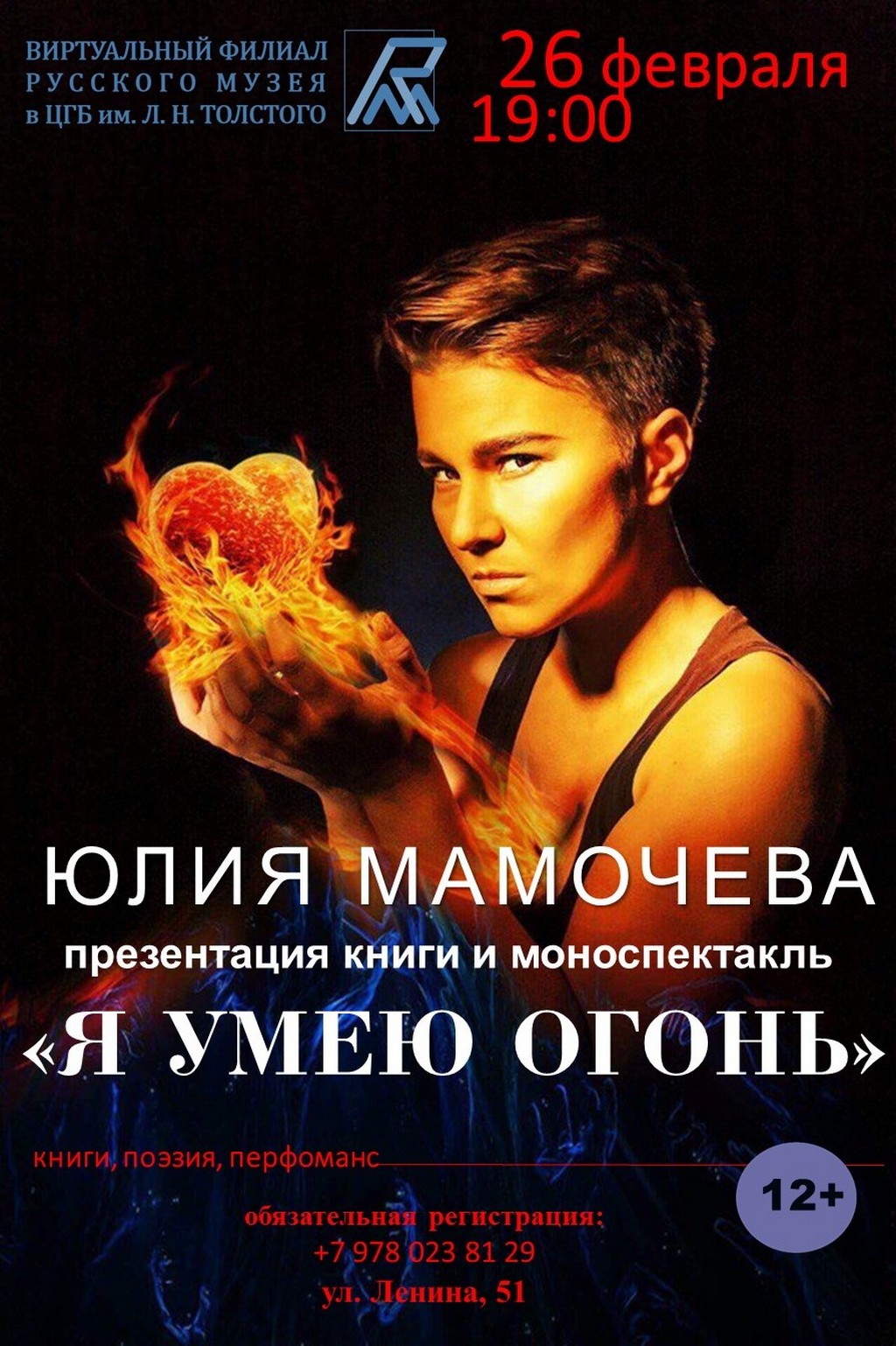 В Виртуальном филиале Русского музея Центральной городской библиотеки им. Л. Н. Толстого состоялась встреча с поэтом Юлией Мамочевой, презентация книг и моноспектакль «Я умею огонь».