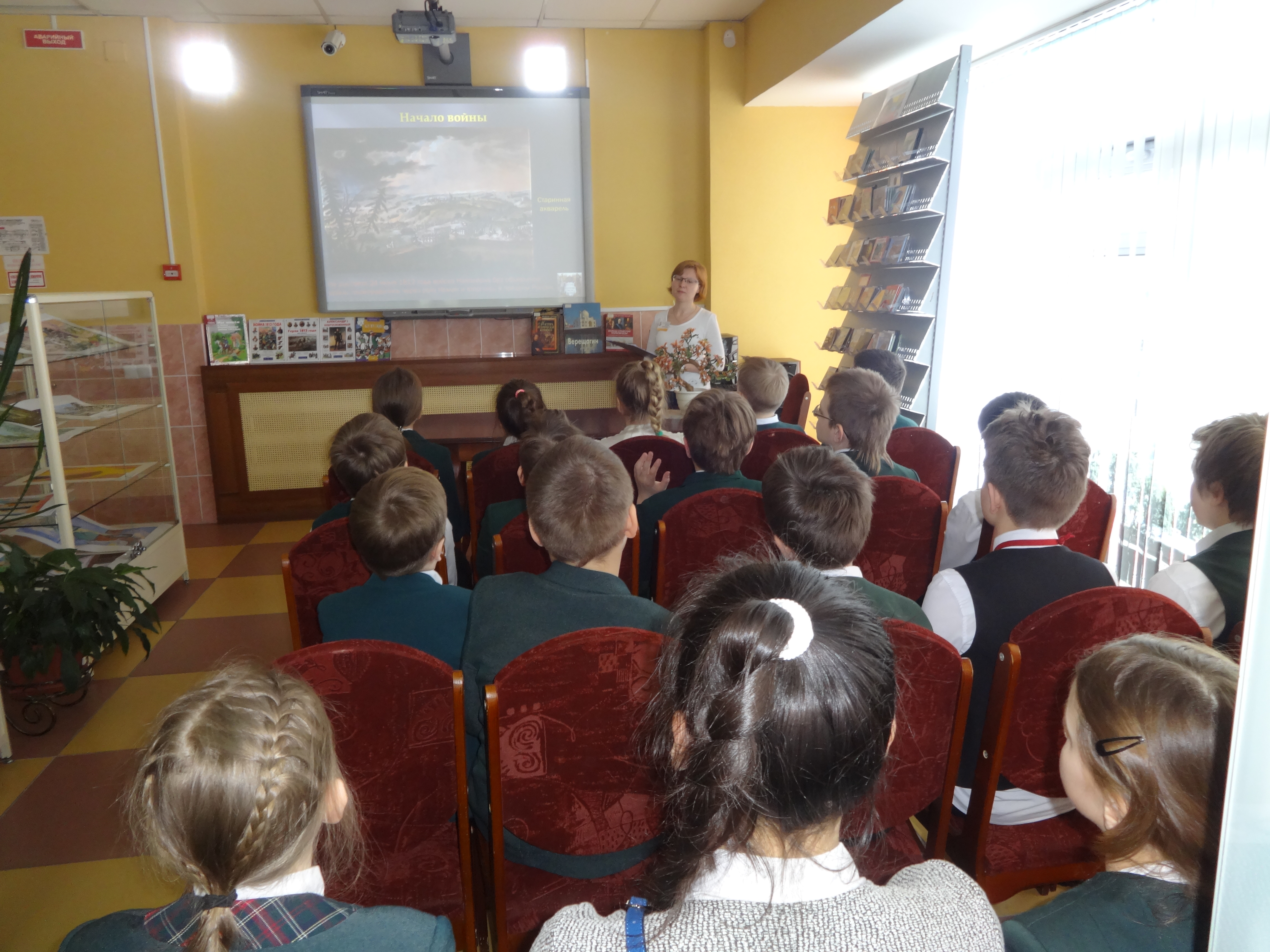 20 марта  2018 года библиотекарь зала искусства Ольга Николаевна Лыженкова провела беседу «Отечественная война 1812 года». Ведущая рассказала ученикам 4 класса школы №106 о борьбе русских солдат с «Великой армией» Наполеона, об основных сражениях и знаменитых полководцах, также показала видеоматериалы, посвященные  Смоленскому сражению и Бородинской битве. Особое внимание было уделено циклу полотен «1812 год» художника-баталиста Василия Верещагина. Мероприятие сопровождалось электронной презентацией, книжно-иллюстративной выставкой и библиографическим обзором. При подготовке беседы использовались материалы электронного каталога «1812 год в произведениях искусства из собрания Русского музея».