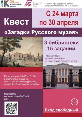 С 24 марта по 30 апреля в Центральной библиотеке им. М. М. Зощенко, городской библиотеке Зеленогорска и библиотеке поселка Песочный проходит квест «Загадки Русского музея», в ходе которого участникам предстоит выполнить 15 заданий, зашифрованных в QR-кодах. Игра включает в себя три блока продолжительностью 7 дней каждый.
