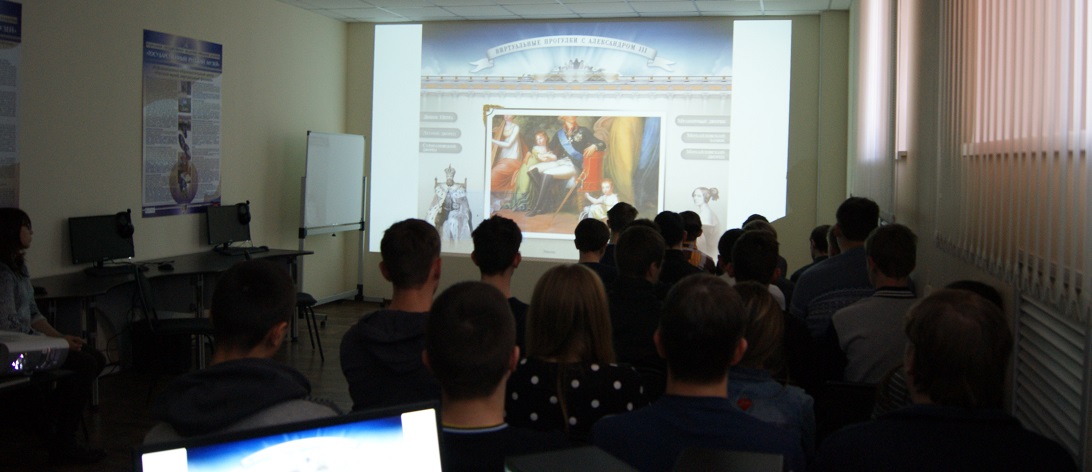 Студенты узнали о том, что первыми владельцами Михайловского дворца были Великий князь Михаил Павлович и Великая княгиня Елена Павловна. При Великом князе Михаиле Павловиче и его супруге Михайловский дворец был центром культурной жизни Петербурга. Нигде в городе больше не устраивались такие великолепные музыкальные вечера и торжественные приёмы, на которые собиралось, казалось, весь свет Петербурга, где бывал весь дипломатический корпус. При потомках Михаила Павловича и Елены Павловны жизнь в Михайловском дворце, казалось, остановилась, больше не проводились роскошные праздники и костюмированные балы, в залах дворца не собиралось изысканное общество. В 1895 году дворец был выкуплен Николаем II для устройства в нём Русского музея в память императора Александра III. Так началась новая жизнь дворца. После вынужденной перестройки и переделки большинства интерьеров, 19 марта 1898 года состоялось торжественное открытие первого в стране государственного музея русского изобразительного искусства. Всю эту информацию учащиеся получили благодаря фильму «Дворцы Русского музея: виртуальные прогулки с Александром III» из медиатеки виртуального филиала.