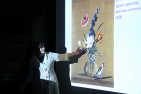 Свою экскурсию мы продолжили с подробного рассматривания картины Ф. Толстого «Букет цветов, бабочка и птичка» и постарались найти тайны, которые спрятал художник в этом интересном натюрморте. Разгадку нашли в дружбе, гармонии сорванных цветов и живых маленьких существ – мушек, бабочек, птички. Как все они красивы, как удивительно их нарядила природа, как украшают они друг друга, какой праздник для глаз! Художник своей картиной говорил нам: быть внимательным к природе, и она щедро откроет нам свою красоту, свои тайны. Дополнили свои впечатления рассматриванием букетов цветов в картинах: К. Петрова-Водкина «Утренний натюрморт», И. Левитана «Васильки», И. Тырса «Букет», П. Кончаловского «Сирень на фоне зелёных ставен», М. Сарьяна «Цветы Калаки», П. Кузнецова «Цветы», А. Головина «Купавки».