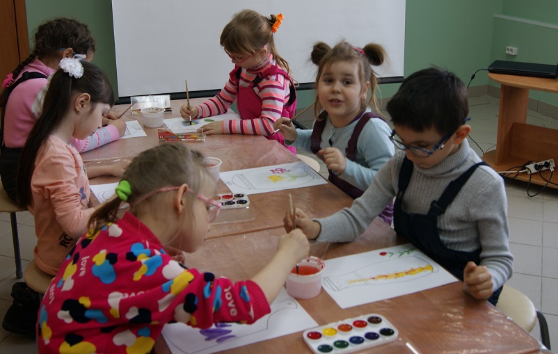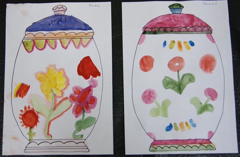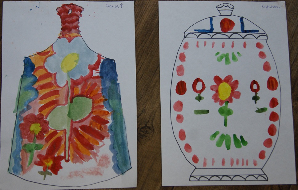 После того, как ребята увидели, благодаря интерактивной программе медиатеки виртуального филиала, какие городецкие игрушки хранятся в Русском музее, то сами расписали бумажные заготовки городецкой росписью. Нераспустившиеся бутоны, крупные цветы различного цвета, веточки, листочки, капли появились на рисунках.