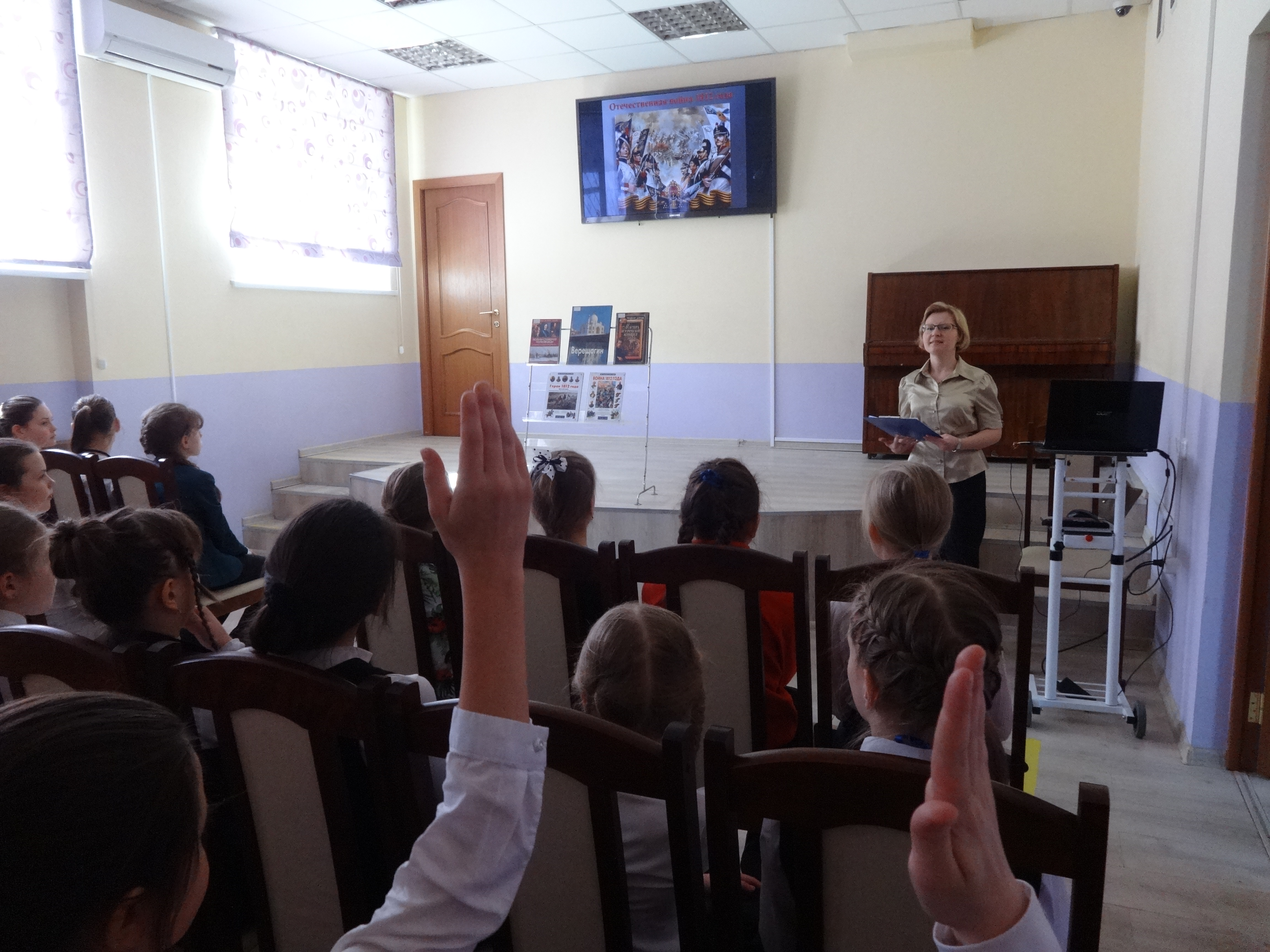12 апреля 2018 года библиотекарь зала искусства Ольга Николаевна Лыженкова провела беседу «Отечественная война 1812 года». Ведущая рассказала ученикам 4 класса школы №106 о борьбе русских солдат с «Великой армией» Наполеона, об основных сражениях и знаменитых полководцах, также показала видеоматериалы, посвященные Смоленскому сражению и Бородинской битве. Особое внимание было уделено циклу полотен «1812 год» художника-баталиста Василия Верещагина. Мероприятие сопровождалось электронной презентацией, книжно-иллюстративной выставкой и библиографическим обзором. При подготовке беседы использовались материалы электронного каталога «1812 год в произведениях искусства из собрания Русского музея».