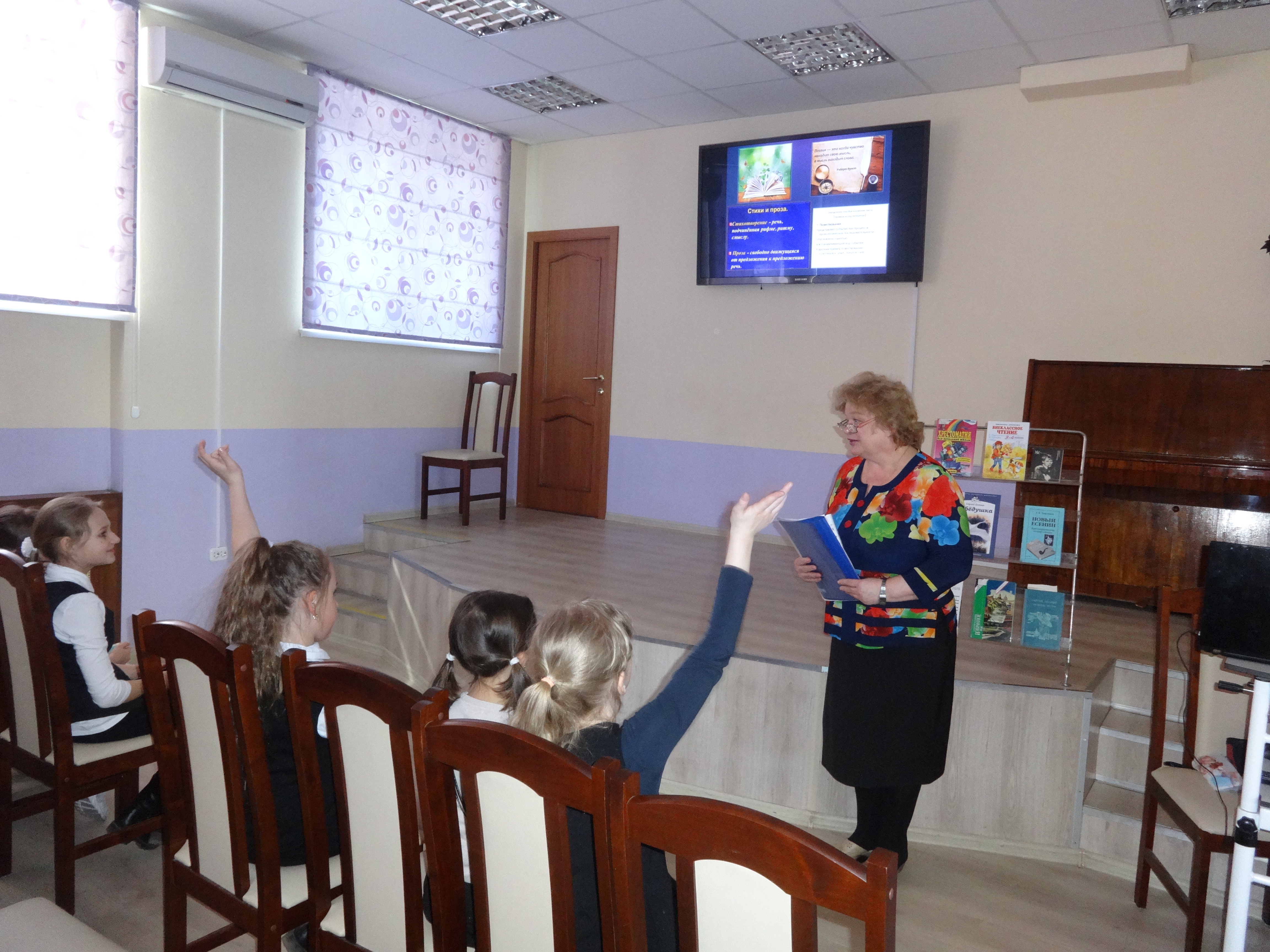 23 апреля 2018года библиотекарем зала искусства Зинаидой Николаевной Тимофеевой были проведены занятия с учениками 3 и 4классов 106 школы, посвященные творчеству поэта Сергея Есенина. Ребята познакомились с автобиографией поэта, посмотрели видеофильм о селе Константиново. Творчество Есенина было представлено видеофильмами с чтением стихов профессиональных чтецов. Были представлены документальные кадры кинохроники с Сергеем Есениным и Айседорой Дункан. Ученики услышали стихи в исполнении поэта. В презентации были представлены картины с изображением пейзажей зимней природы: Игоря Грабаря, Алексея Саврасова, Бориса Кустодиева и Аполлинария Васнецова. Ребята ответили на вопросы библиотекаря по прослушанному материалу и прочитали наизусть стихотворения, которые они выучили в школе.