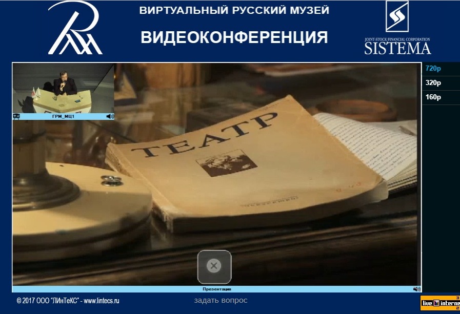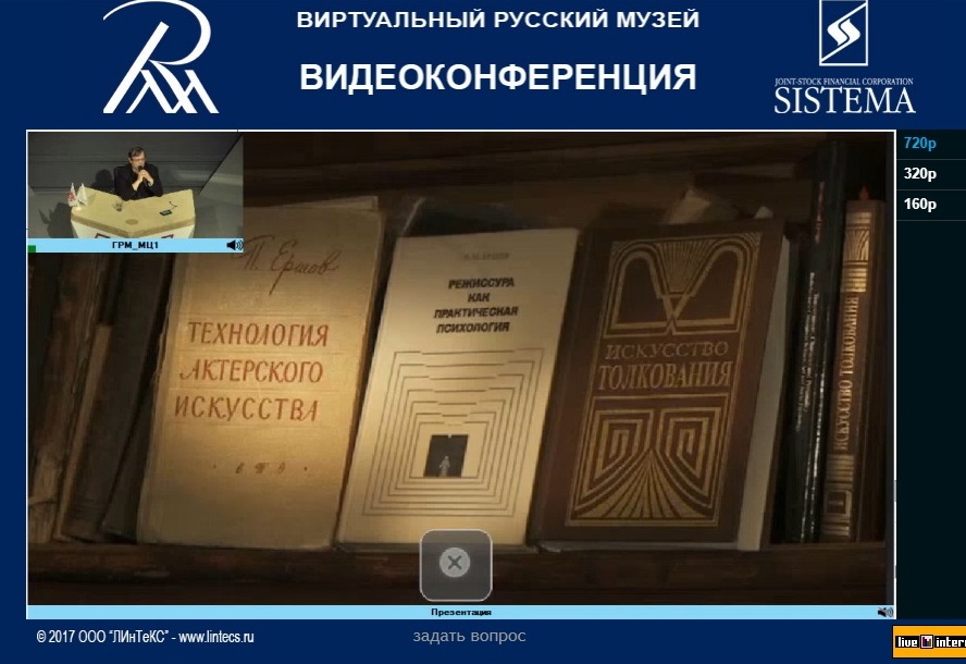 Лекция была  организована в формате онлайн-трансляции из Мультимедийного центра Русского музея г. Санкт-Петербурга при поддержке НП "Виртуальный Русский музей" в рамках 10 Всероссийского фестиваля короткометражного кино "Арткино", проводимого при поддержке Фонда президентских грантов.
