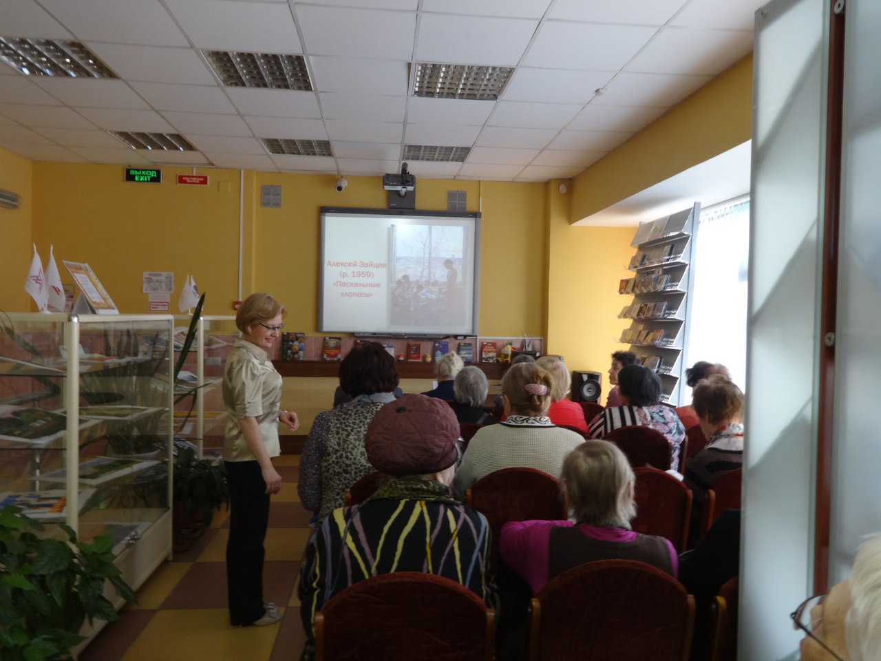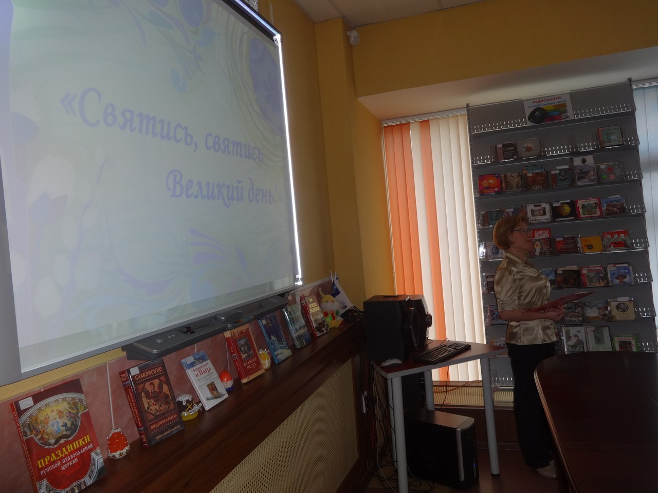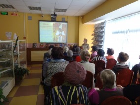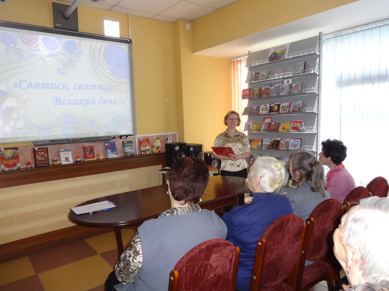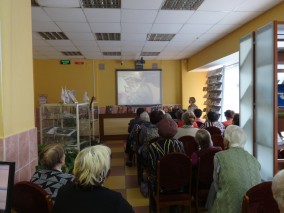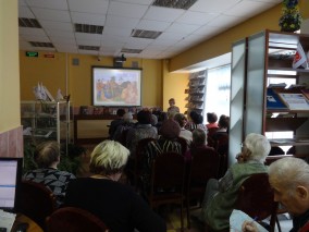 Мероприятие продолжилось в зелёной гостиной, где руководитель абонемента Нинель Агеева накрыла праздничный стол. Члены Совета ветеранов, приглашённые на праздник, приняли активное участие в организации мероприятия. Праздничное чаепитие сопровождалось показом слайд-шоу «Пасха в живописи», которое также подготовила и представила библиотекарь зала искусства Ольга Лыженкова.