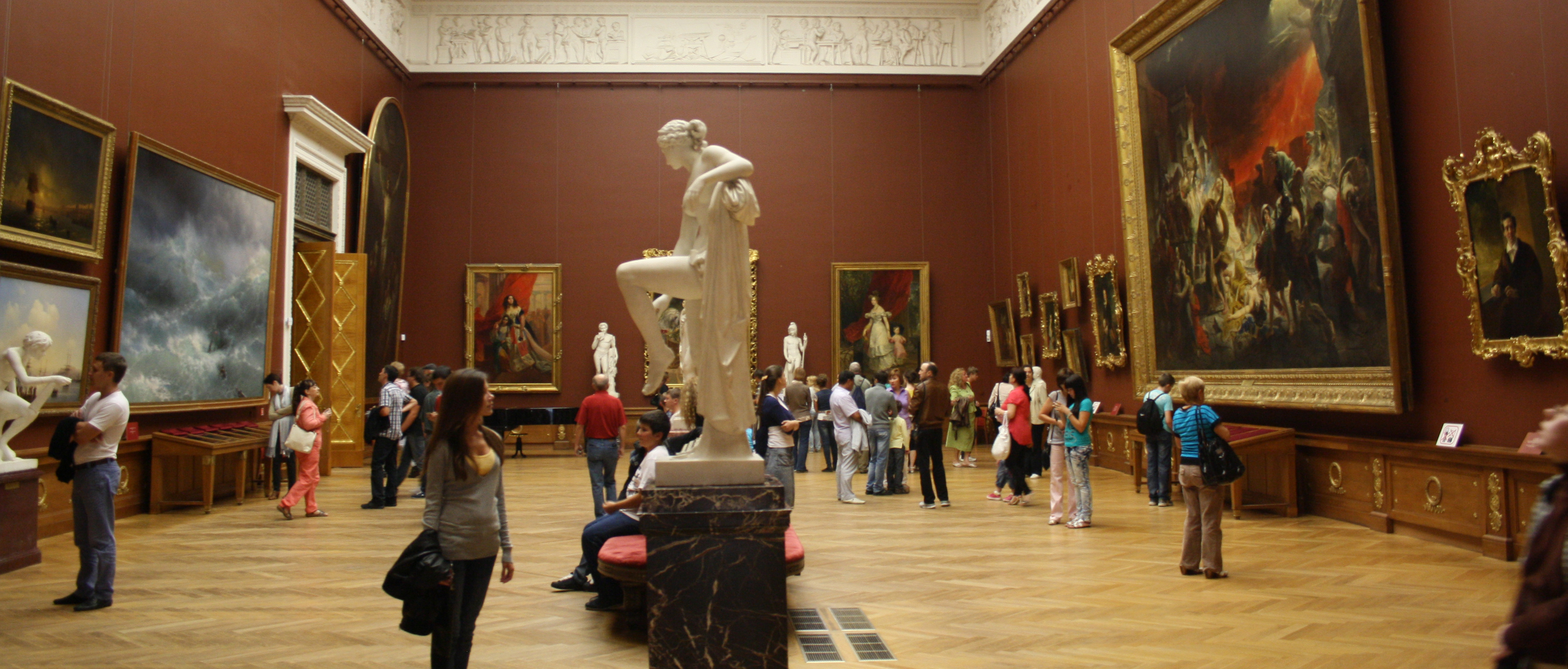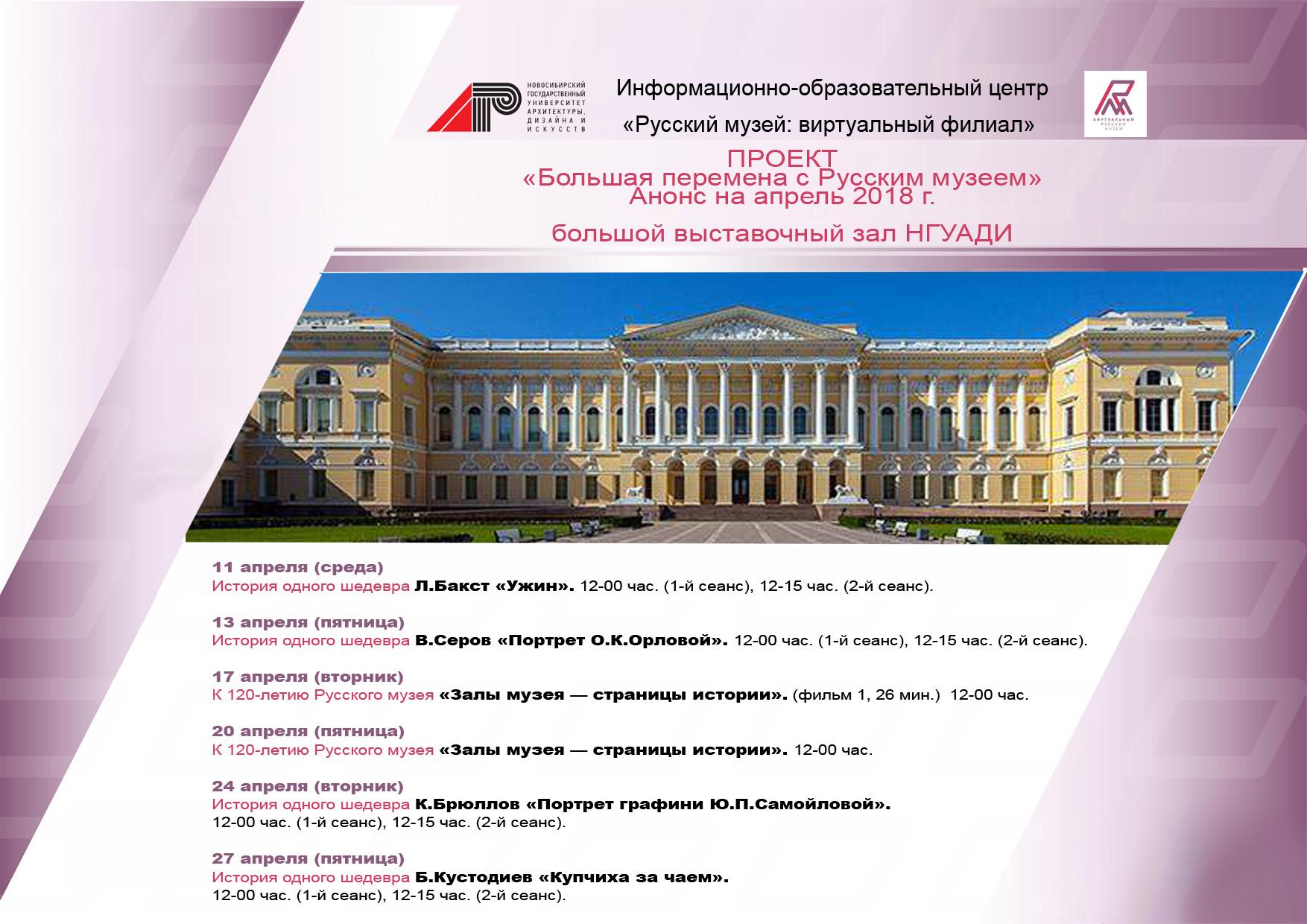 В большом выставочном зале НГУАДИ во время большой перемены у всех желающих есть возможность посмотреть мультимедийные фильмы из ресурсов медиатеки виртуального филиала Русского музея: о коллекции Русского музея, истории русского искусства, истории одного произведения, истории дворцов и парков, входящих в состав музейного комплекса.